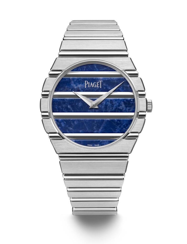 非常に汎用性の高いPiaget Polo 79は、時を経てさまざまなバリエーションが生まれ、今シーズンは同じく38mmで1200P1自社製薄型自動巻ムーブメントを搭載したツートーンバージョンで復活しました。イエローゴールド、ホワイトゴールド、そして新たに2種類のゴールドで登場したPiaget Polo 79の成功に続き、Piaget Polo 79はメゾンのもうひとつの象徴であるオーナメンタルストーンで装いました。以前はオニキスやラピスラズリが使用されていましたが、今日初めて、オーナメンタルストーンが貴重なソーダライトバージョンで現代的なラインナップに加わりました。対照的なミネラル文字盤が、ピアジェが大切にしているユニークなゴドロン装飾を際立たせています。