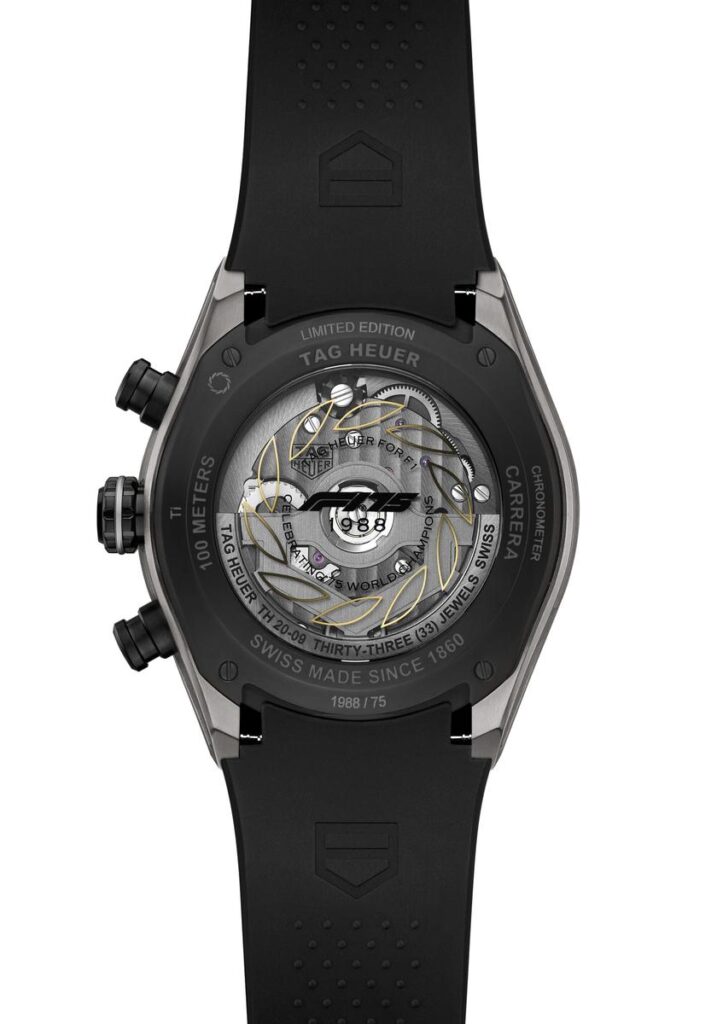 さらに、タキメーターの12時位置にシルバーのF1(R)ロゴを、75の目盛りにはシルバーの公式F1(R) 75周年記念ロゴを配し、ベゼルとケースバックにも目立つようにあしらうことで、75人のF1(R)ワールドチャンピオンとのつながりを表現しています。