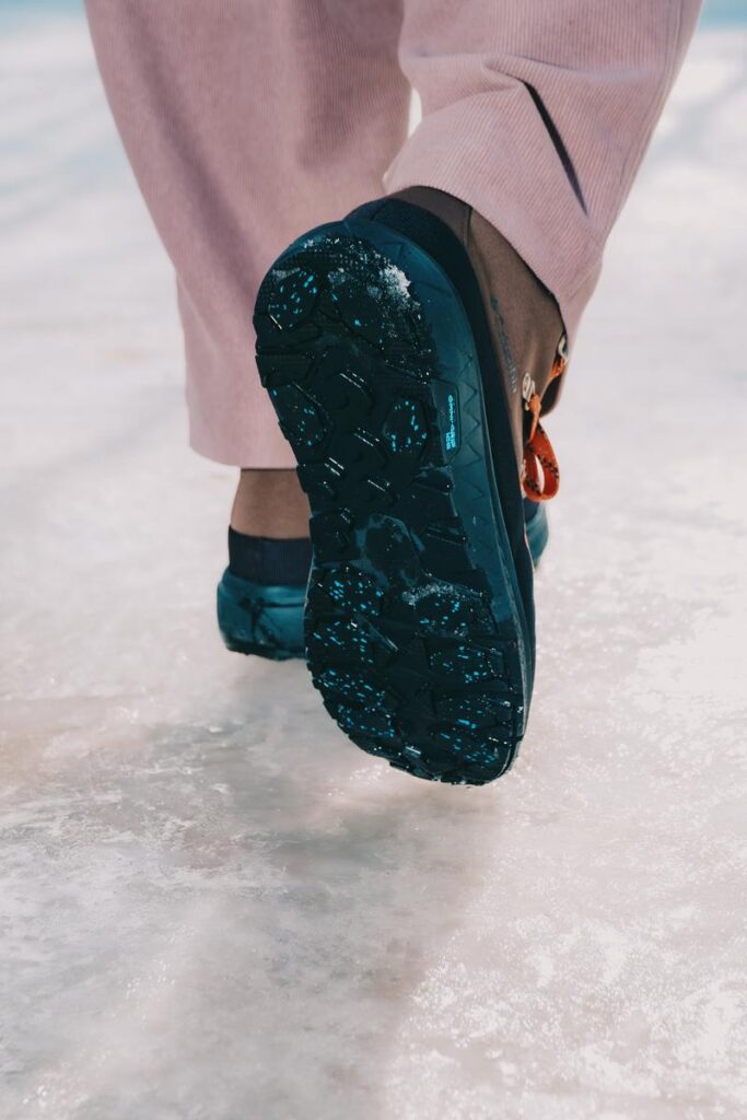 氷上や雪上でしっかりとグリップ力を発揮し、滑りにくい。独自設計の合成繊維配合アウトソール。