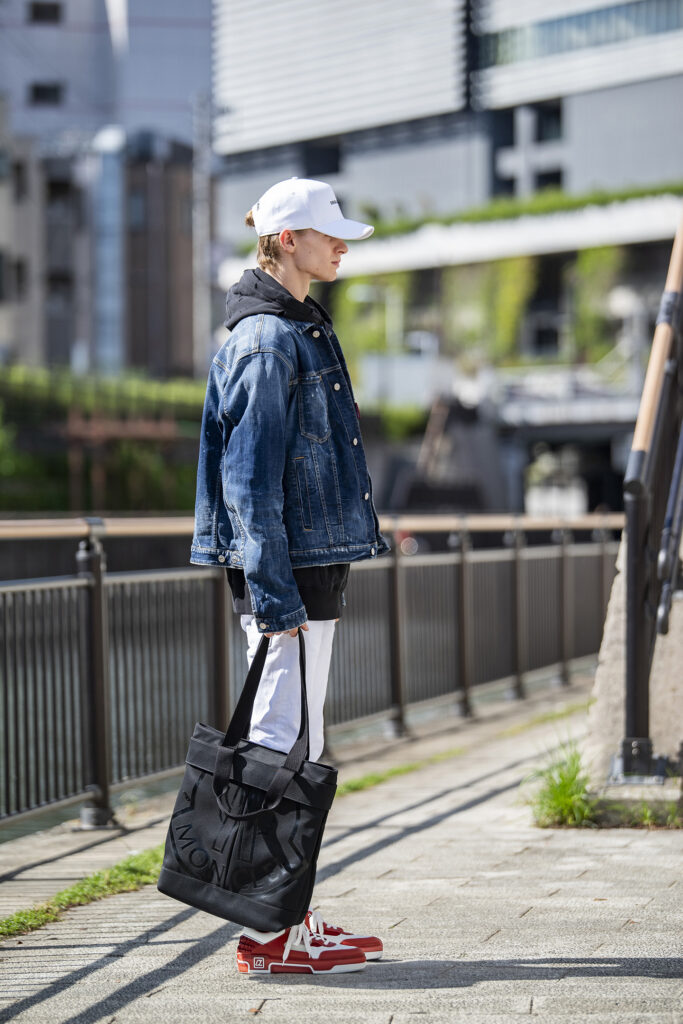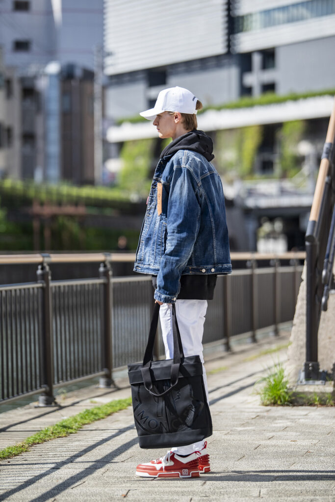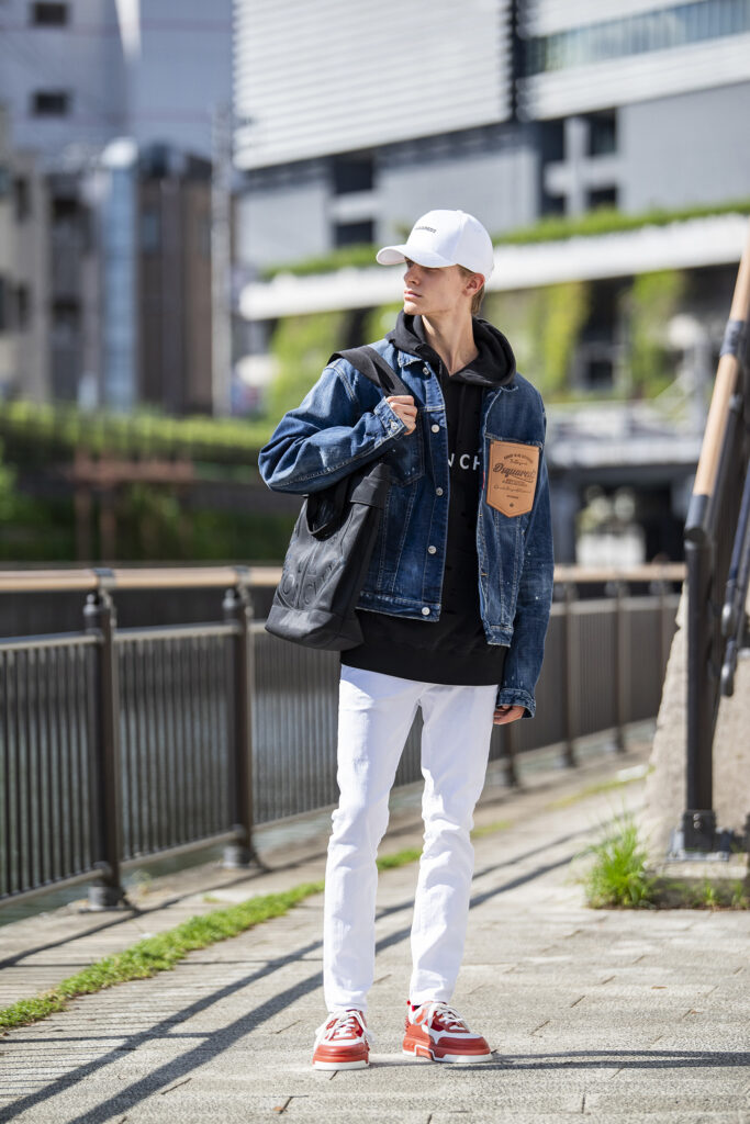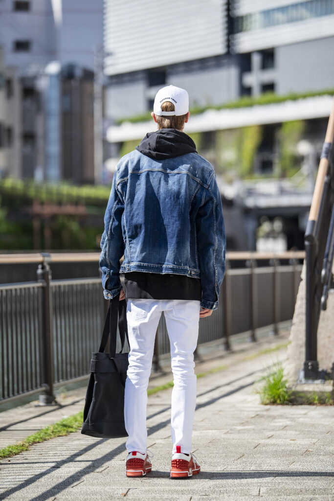 一枚で決まるブルーデニムのジャケットは、いつだって頼れる相棒。男らしさと清潔感を兼ね備え、どんなパンツとも相性がいい。ここでは白スキニーを合わせて、秋冬の爽やかさと軽快さを演出。さらに赤いスニーカーを効かせることで、王道のデニムコーデに新鮮な息吹を与えてみたのがコチラ。同じジャケットでも、別記事/“抜け感”がサマになるデニム×スウェットのスウェットパンツと合わせたスタイルとはまるで異なる印象を作り出します。この振り幅の広さが、季節の変わり目のアウターとして頼もしいですね。