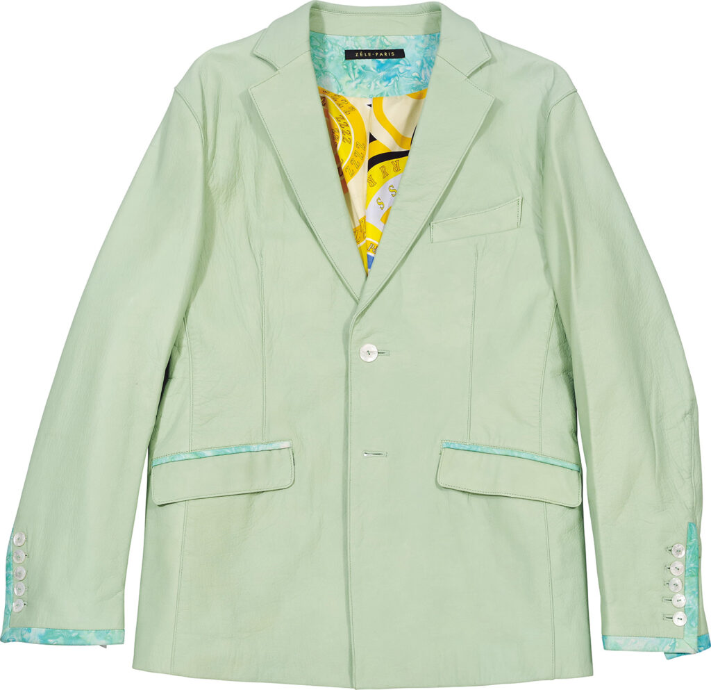 しなやかで軽い鹿革が魅力のラペルジャケット。パイピングをアクセントに、ミントグリーンの色味が上品な抜け感を演出する。着用サイズ:50。124万7000円