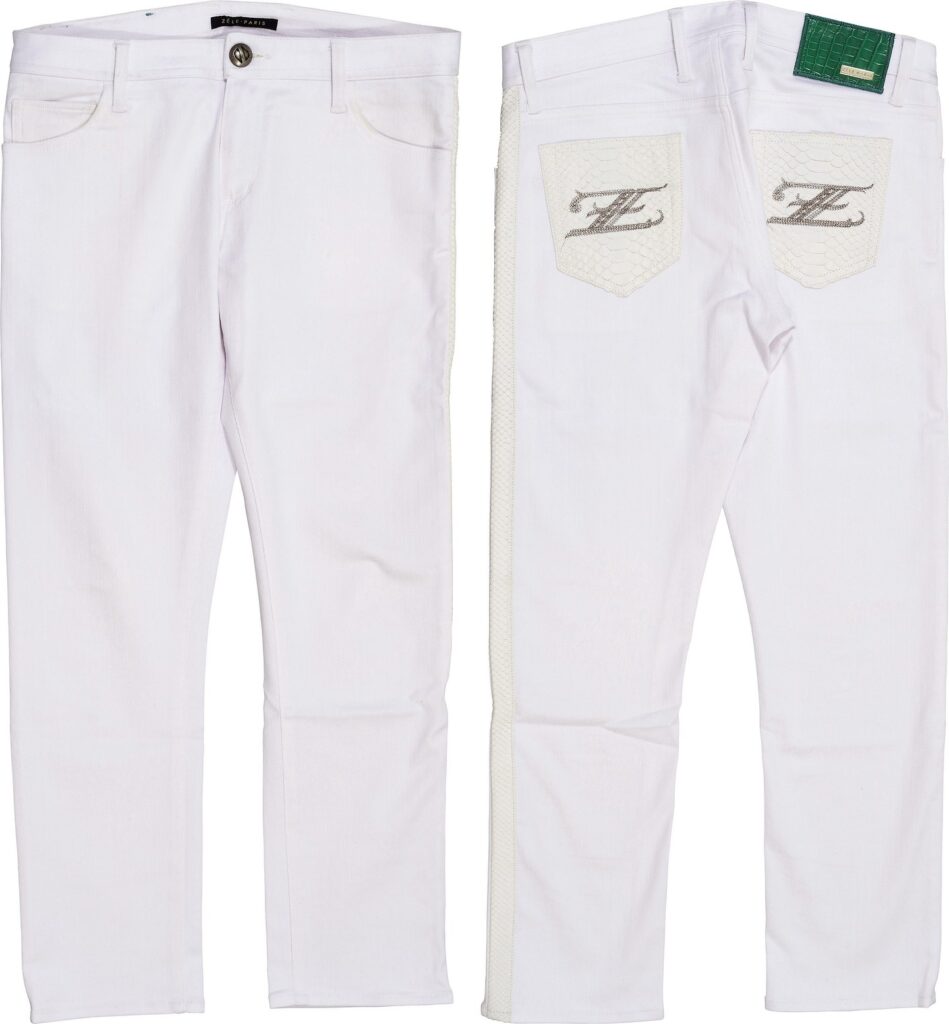 左サイドとバックポケットにさりげなくパイソンレザーを配し、都会的でクリーンな印象の中にも男らしさをもたらす白デニム。着用サイズ:32。37万8000円