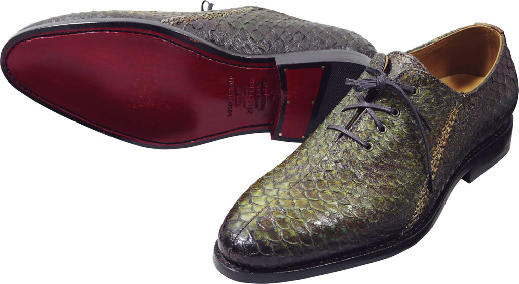 流通の少ない希少素材フィッシュレザー(スズキ)を使用。軽さと耐久性を兼ね備えた大人の遊びシューズとして、足元を個性的に彩ってくれる。38万1000円