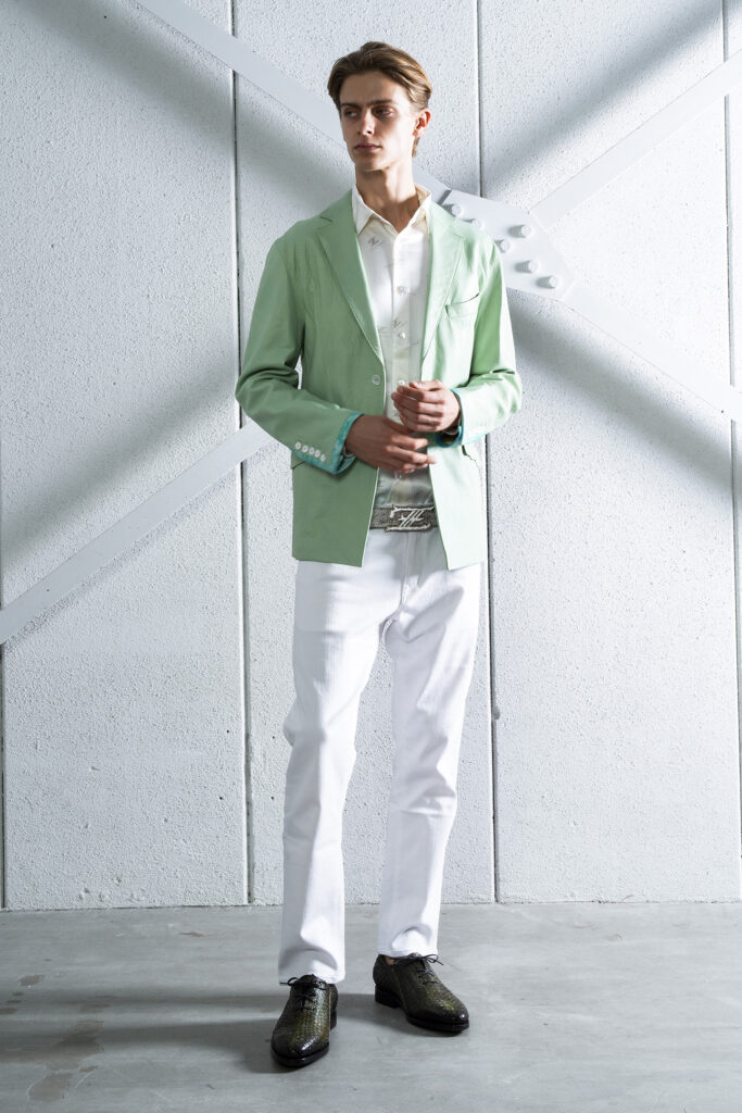 淡く柔らかなミントグリーンに彩られたディアスキン製のラペルジャケット。その鹿革特有のしなやかな質感が、きれいめな印象の中に仄かな色気を漂わせます。さらに、パールカラーのシルクシャツをインナーに差すことで、ラグジュアリーな遊び心をプラス。パイソンレザーをあしらったホワイトデニムが清楚な中にも刺激を与え、足元はスズキ革のシューズで軽やかに。素材の妙で魅せ、洗練された大人の余裕が香る、アーバンなレザーアウターのコーデです。