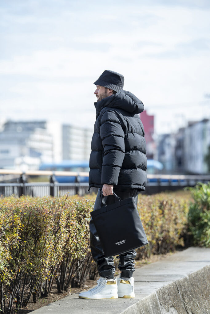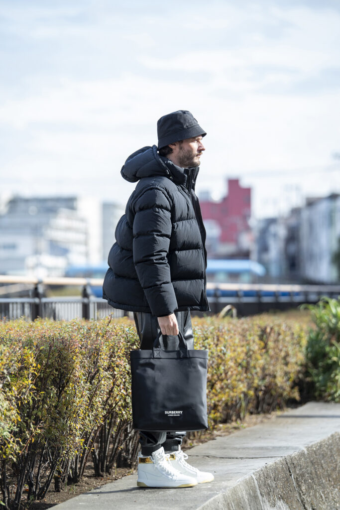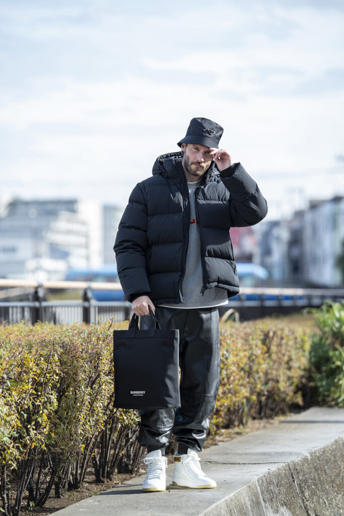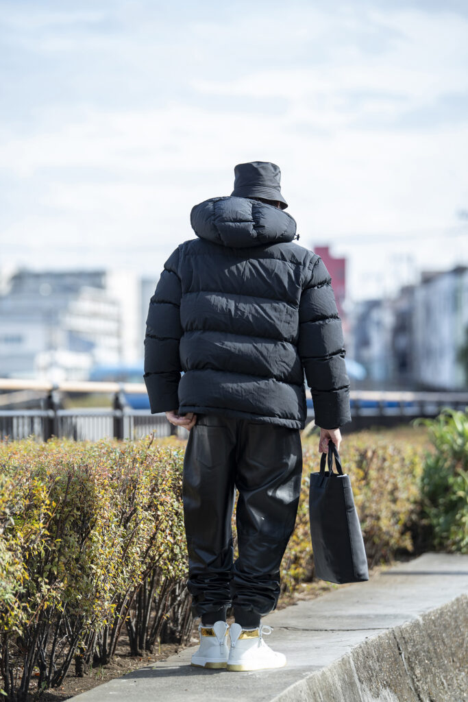 異素材を掛け合わせたブラックコーデで、重く見えがちな黒を柔らかい印象へ。ダウンのボリューム感に、ナイロンやレザーといった質感の違いを重ねることで、黒特有の強さを抑えました。インナーにはロゴ使いの効いたロンTを仕込み、親しみやすさを持たせたのもポイント。レザーのジョガーパンツは、カジュアルにちょっと個性を足したい時にもちょうどいいですよ。仕上げにナイロンバッグと白スニーカーで軽快さを添え、親しみやすさと都会的なムードを両立。