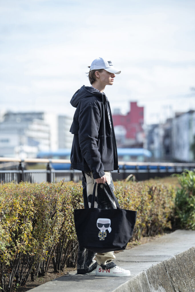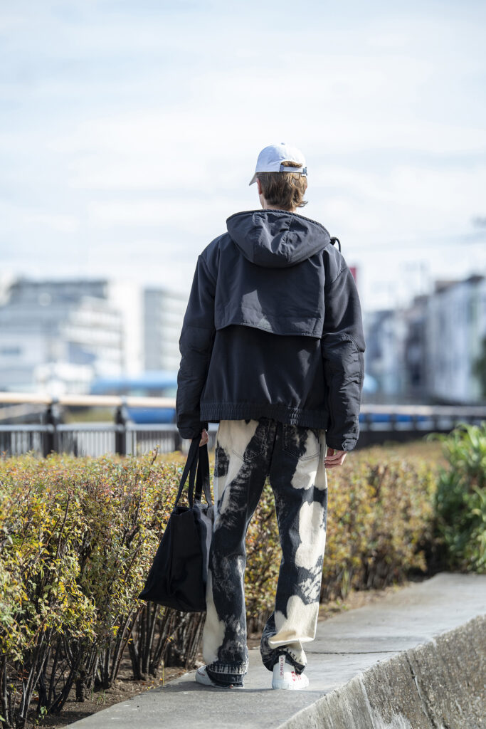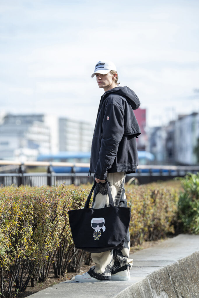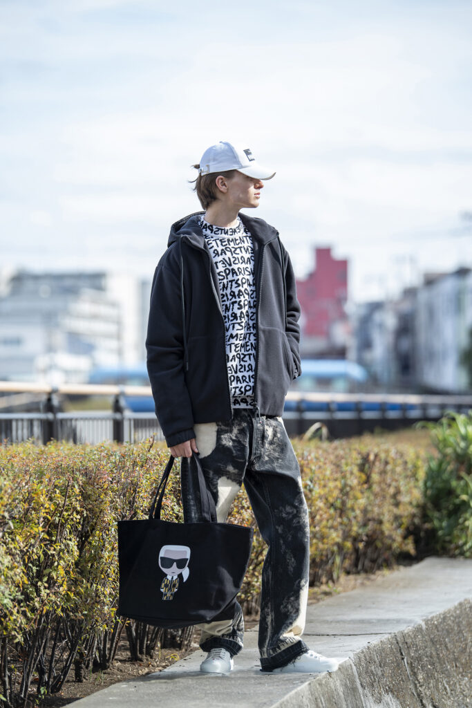 フリース×ナイロンのジップパーカの軽快さをベースに、総柄ニットで程よい主張を効かせたスタイル。ボトムスには、別記事/やんちゃな大人のための「攻め」の休日スタイルのスタイルでカモフラダウンと合わせたブリーチデニムパンツを着回し、似たようなリズムをプラス。柄モノとの組み合わせも、モノトーンで揃えることで強印象にならずにバランス良くまとまってくれるから、大人でも楽しめるスタイルと言えます。キャップと大きめトートでお出かけ感を出せば、気軽な小旅行に最適な格好です。