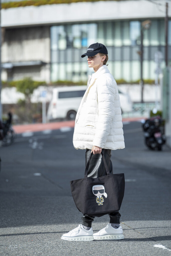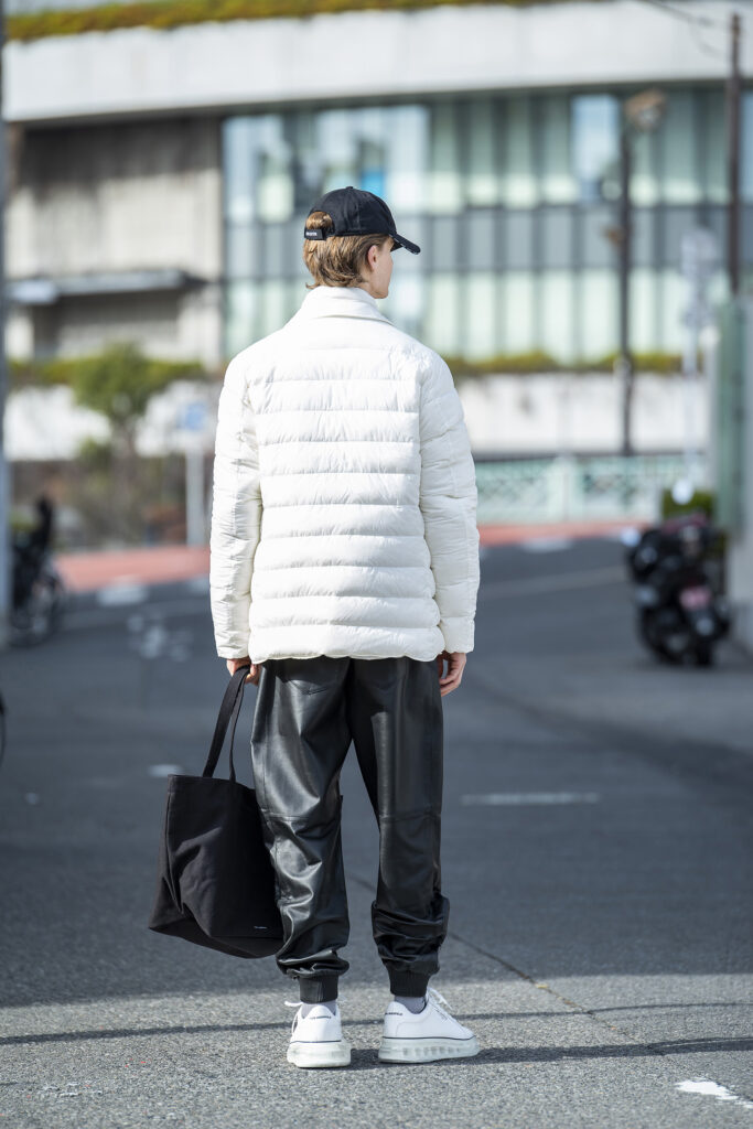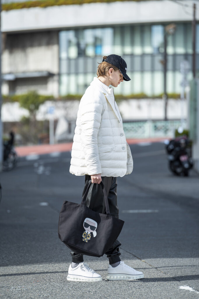 白のダウンで全体をクリーンに引き上げつつ、黒を軸に質感で奥行きを作った都会的カジュアル。ヴェトモンの総柄ニットが視線を集め、ヘルノのダウンが大人の端正さを担保します。カール・ラガーフェルドのラムスキン製ジョガーは、柔らかな光沢で程良い脱力感とともに品位をキープ。足元はクリアソールのスニーカーで軽快かつ個性的に、同ブランドのトートでさりげなく統一感も出しました。ロゴ映えするベルトで腰回りを引き締め、肩肘張らずに着こなしましょう。