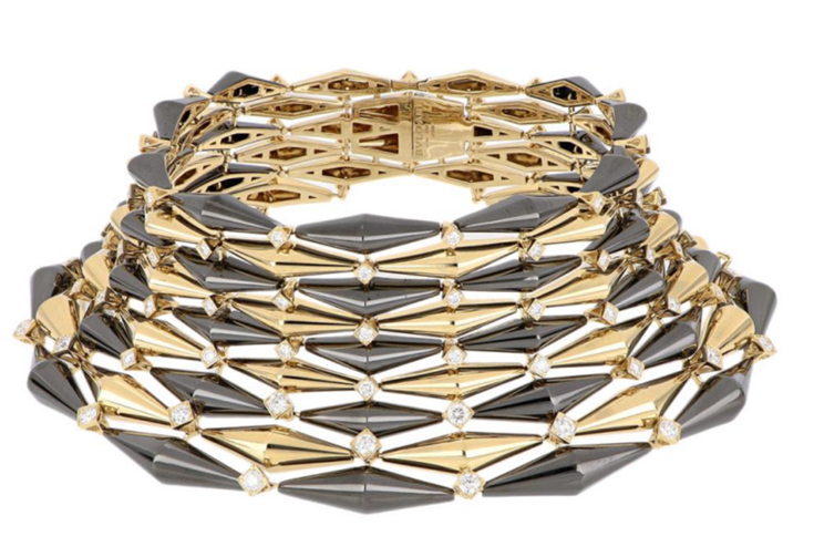 グローバルアンバサダーのリサが着用したハイジュエリーのネックレスは、光と影の幻想的な相互作用を表現し、オリジナルの伝統的なデザインの二色使いの調和を反映しています。イエローゴールドの温かい色合いは、ブラックダイヤモンド・ライク・カーボン(DLC)の大胆な輝きと出会い、ジュエリーに先駆的な新次元をもたらす最先端のコーティング技術です。