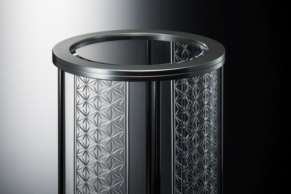 「麻の葉」柄は、成長の早い麻にあやかり、子どもの健やかな成長を願う意味が込められていることから、成長や繁栄を象徴するものとして様々な場面でのギフトにも好適です。また、六角形を基本とした連続する幾化学的な模様を曲面にあしらうことで、周囲の光を受け、空間に華やかさと奥行きをもたらします。