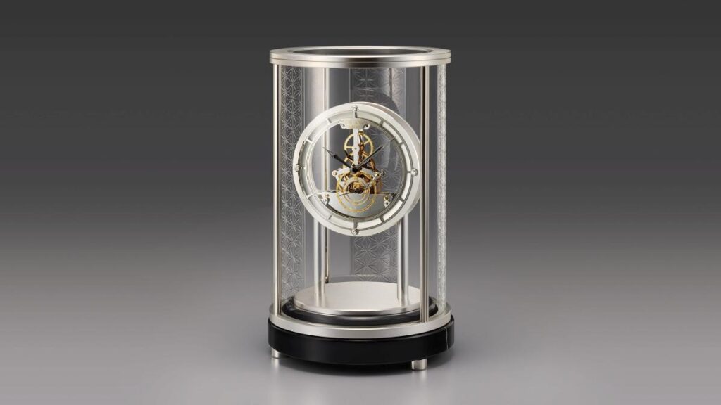 | 材質 | 本体:金属(アルミ・ヘアライン光沢仕上げ) 文字板:金属(ステンレス・プラチナめっき) 文字サークル:金属(アルミ・サンドブラスト一部研磨光沢仕上げ) 飾り:クリスタルガラス 台:黒大理石 ケース:ガラス(高透過曲面ガラス・江戸切子 麻の葉文様・研磨光沢仕上げ、高透過カットガラス) 金属(アルミ・ヘアライン光沢仕上げ、黄銅・プラチナめっき) |