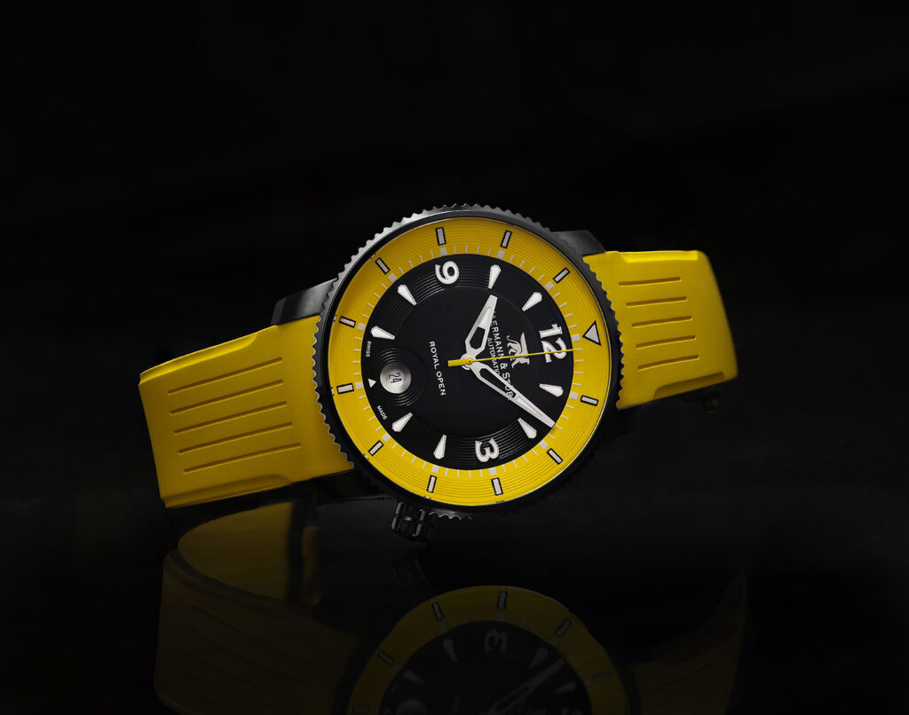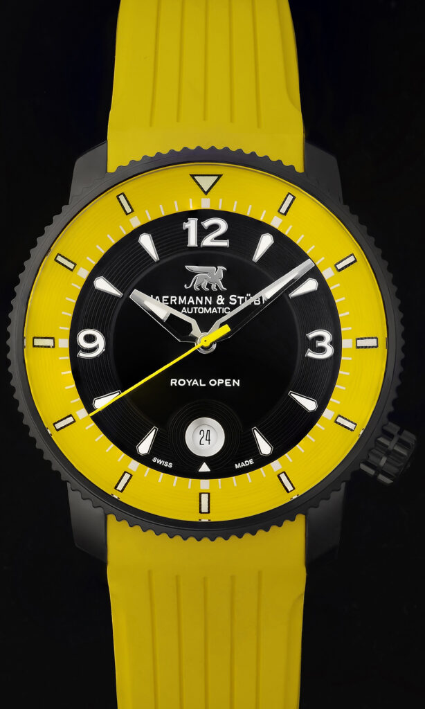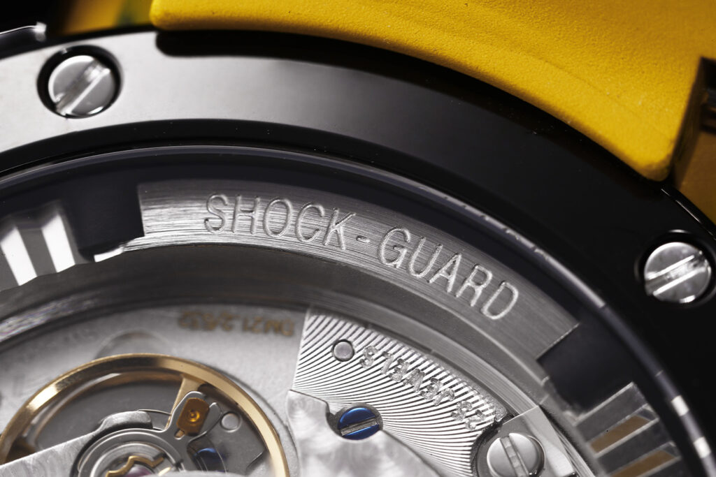 ゴルファーを強く意識したJAERMANN & ST?BI(ヤーマン&ストゥービ)ならではのショックアブソーバーを装備。ボディはブラック加工されたチタン製で、ブラック×イエローのコンビネーションも実にスタイリッシュです。42時間のパワーリザーブ付き。