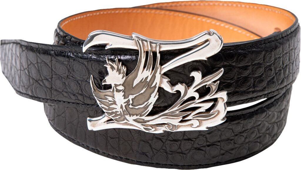 クロコダイルベルト フェニックス 925シルバー(黒)。バックルサイズ/タテ53mm×ヨコ73mm。35mm幅レザー。