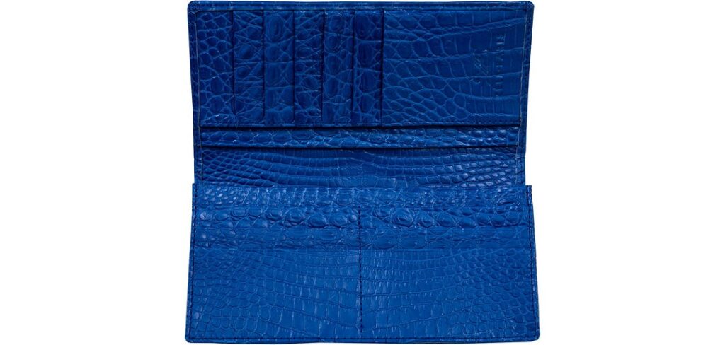 ナイルクロコダイル コンコルド ウォレット(ブルー)。タテ9.5cm×ヨコ18.5cm×マチ2.5cm。