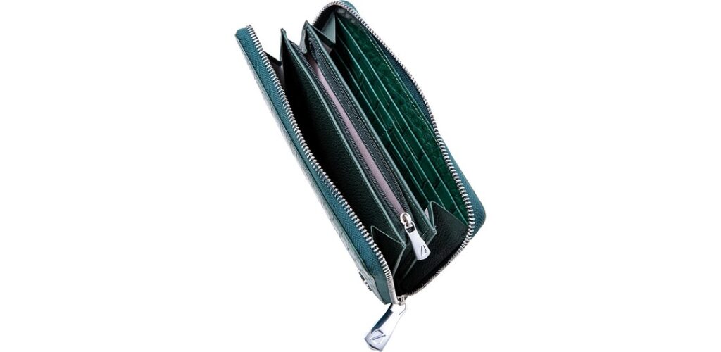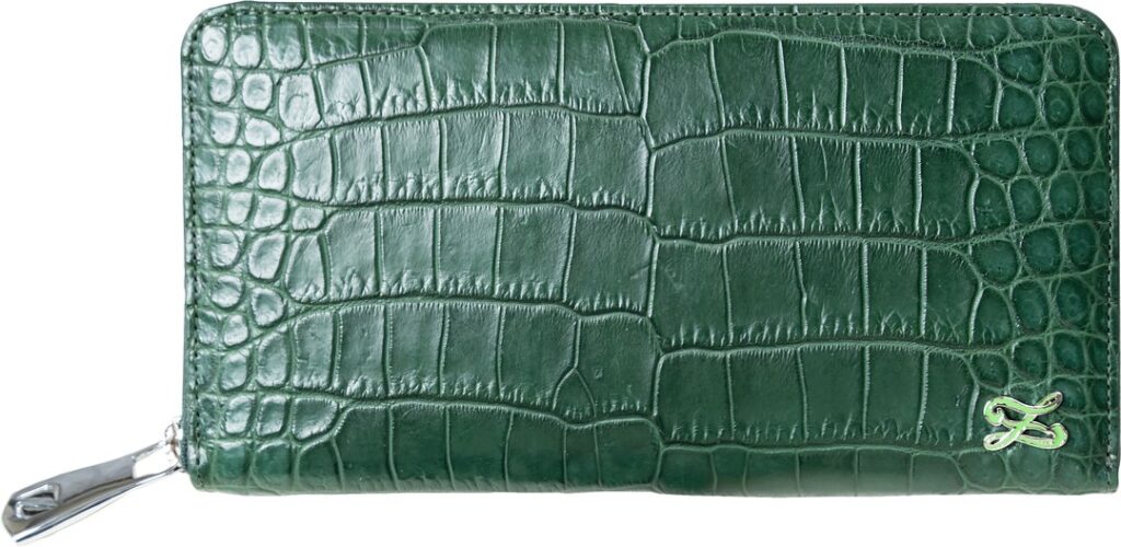 ジップウォレット「ナイルクロコダイル シングルファスナー ウォレット」は、シックで上品なブリティッシュグリーン。スーツ姿で取り出しても違和感を与えない深みのある色合いなので、オンオフ問わず使える財布です。