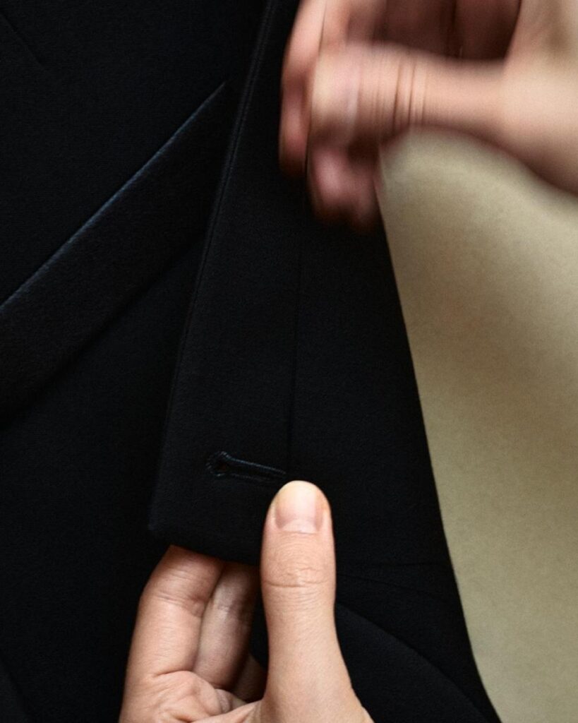 マイケル・B・ジョーダンが着用したブラックのオフィサーカラージャケットは、100%ウールで仕立てられ、エレガントなシルクサテンの胸ポケットとパイピングのディテールが特徴。また、ブラックとゴールドのロゴ入りボタンで装飾されています。