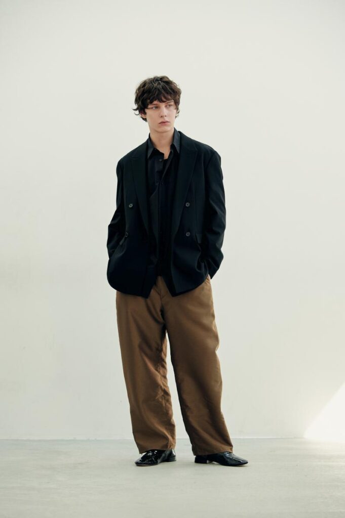 ダブルブレストのジャケットを軸に、洗練されたモダンスタイルを構築。ブラックで統一した上半身に、ブラウンのパンツを合わせることで程よいコントラストを演出し、都会的で落ち着きのある印象に仕上げている。