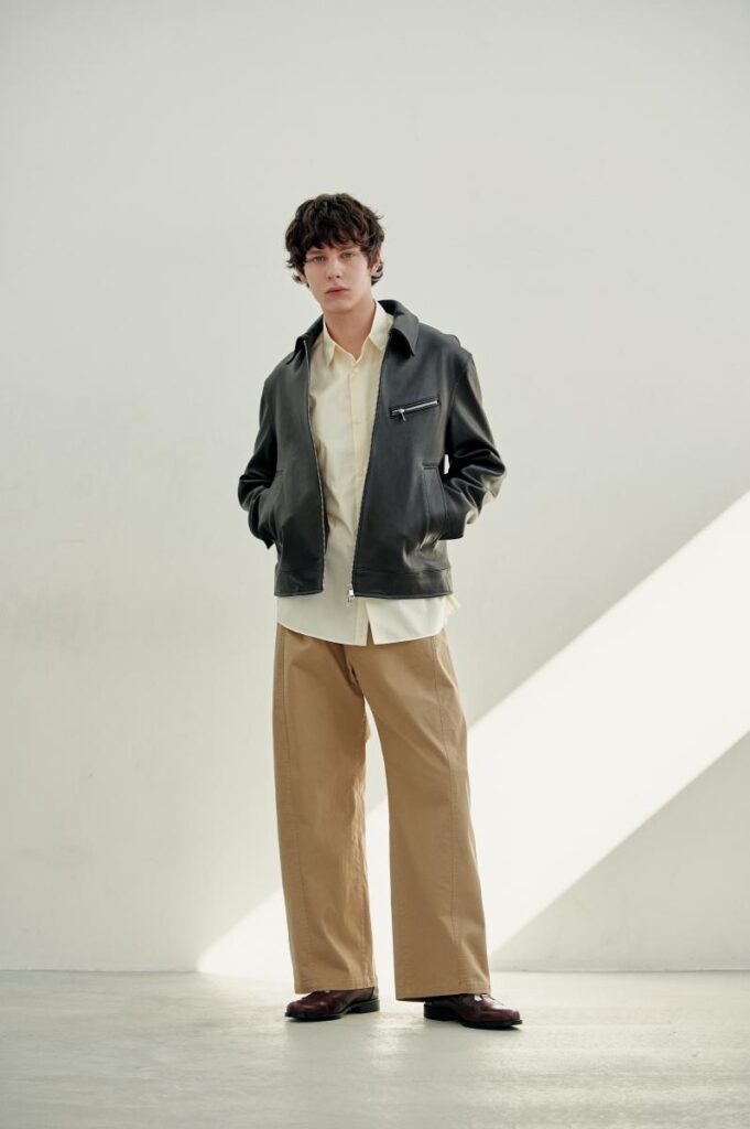 レザージャケットを主役に据えた2つのスタイリング。グレーのセットアップで品よくまとめた着こなしと、ベージュパンツで軽やかに仕上げたスタイルが、無骨さと洗練をバランスよく引き立てる。