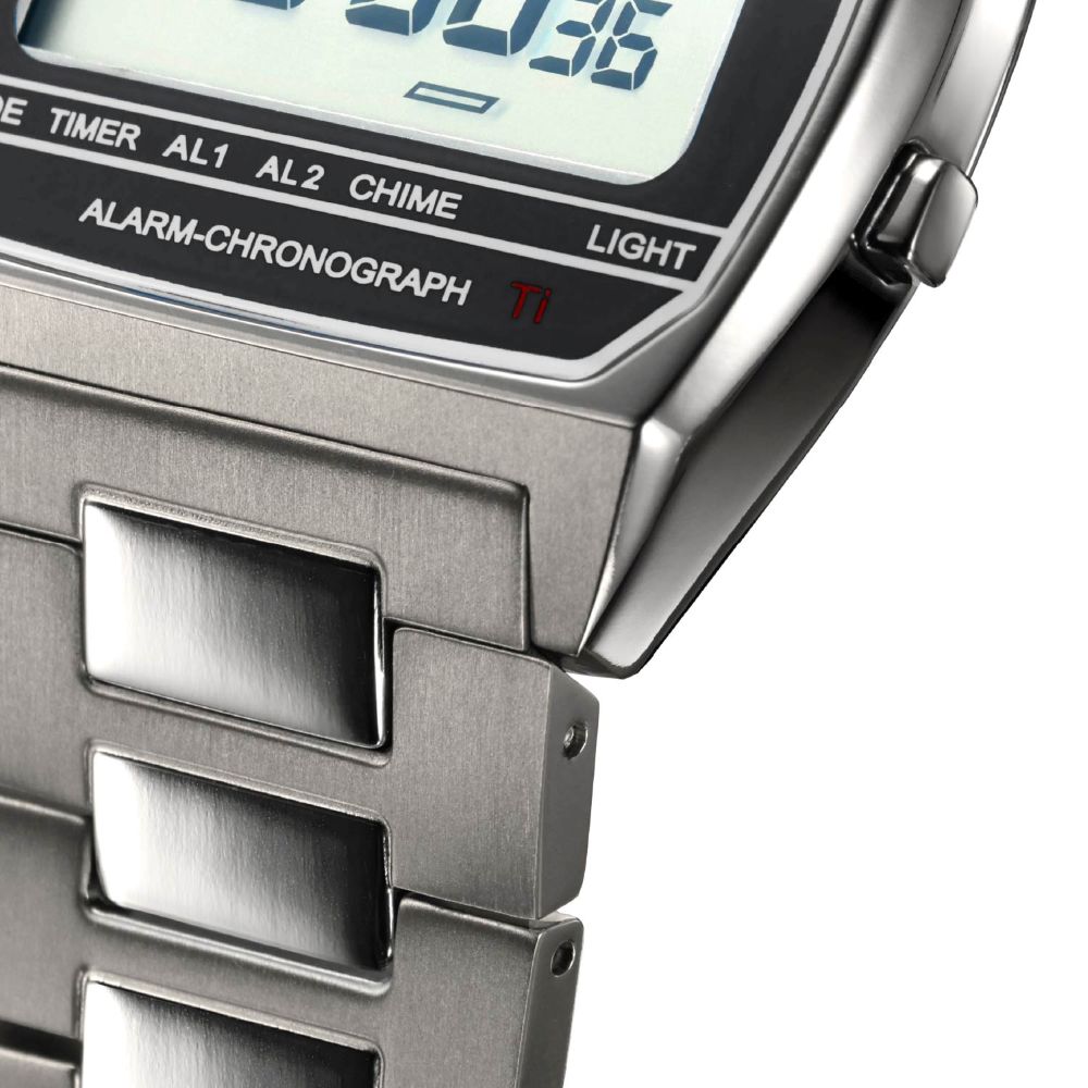 バックライト、アラーム、ストップウォッチ、ワールドタイムなど、デジタルウォッチならではの多彩な機能と、細部へのこだわりを感じさせるコンビネーション仕上げのケースとブレスレット。