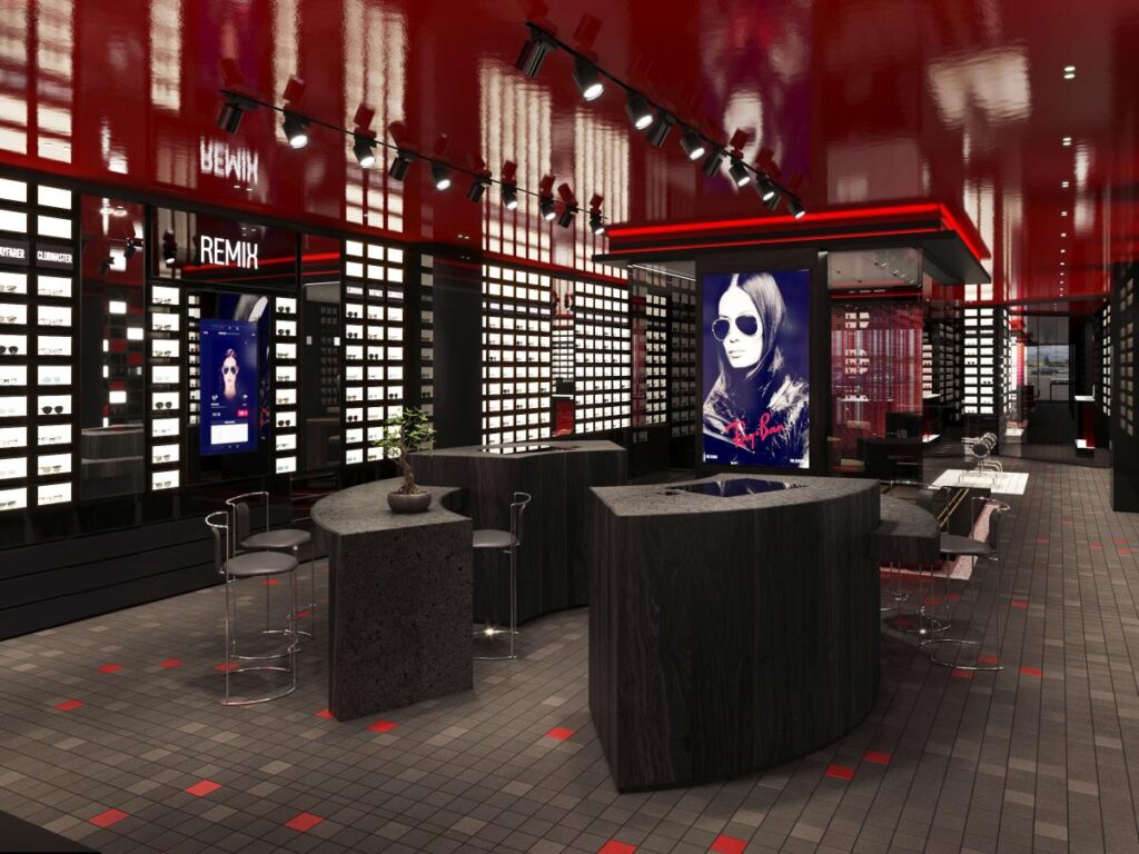 270平方メートル の店内にはブランドカラーであるアイコニックな赤と黒を基調としたシックな内装に、伝統的な日本の要素を取り入れています。本物の溶岩タイルを使用したフロアは、自然が持つ力強い美しさを表現しています。ブランドのシグネチャーカラーでもあり、日本の美意識へのオマージュでもある赤い天井は、空間全体に温かみと独特の個性を添えています。日本庭園をイメージした木目調のインテリアを使用した検眼室の壁にはスマート調光機能を搭載したスモークガラスを使用しており、より落ち着いて検眼を受けられるプライベート空間を保ちます。