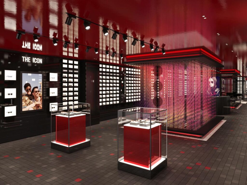 国内最大級の面積となる店内には約1000本のアイウェアが、精密な幾何学模様で彩られたガラスの什器で壁一面にディスプレイされ、アイコンから新作コレクション、キッズやオプティカルコレクションまでフルラインナップが揃います。