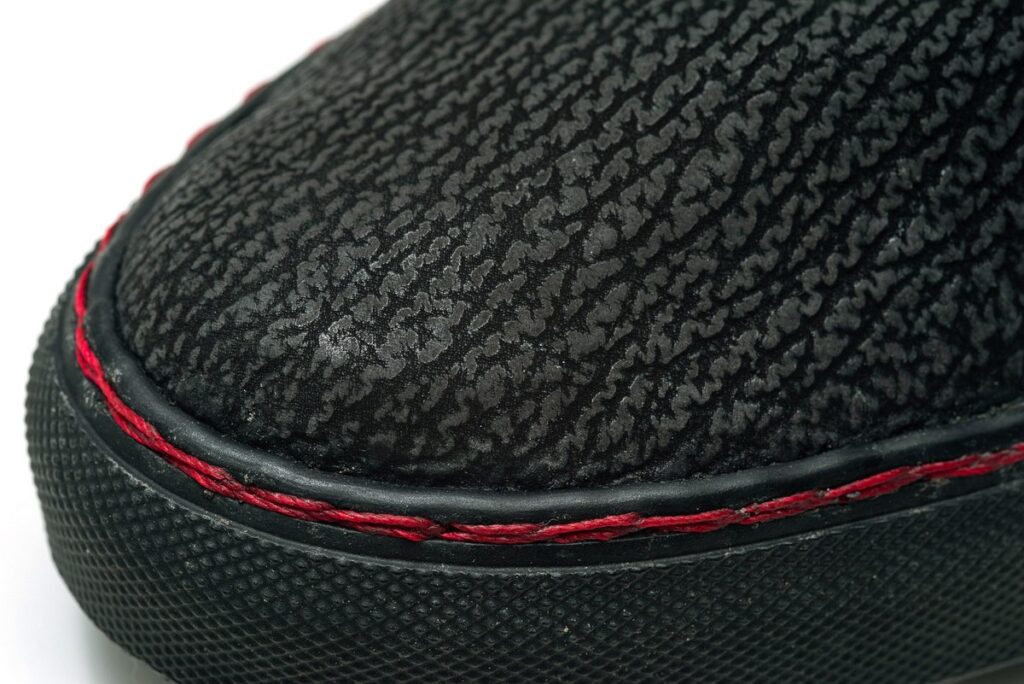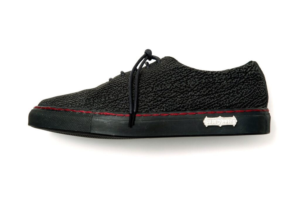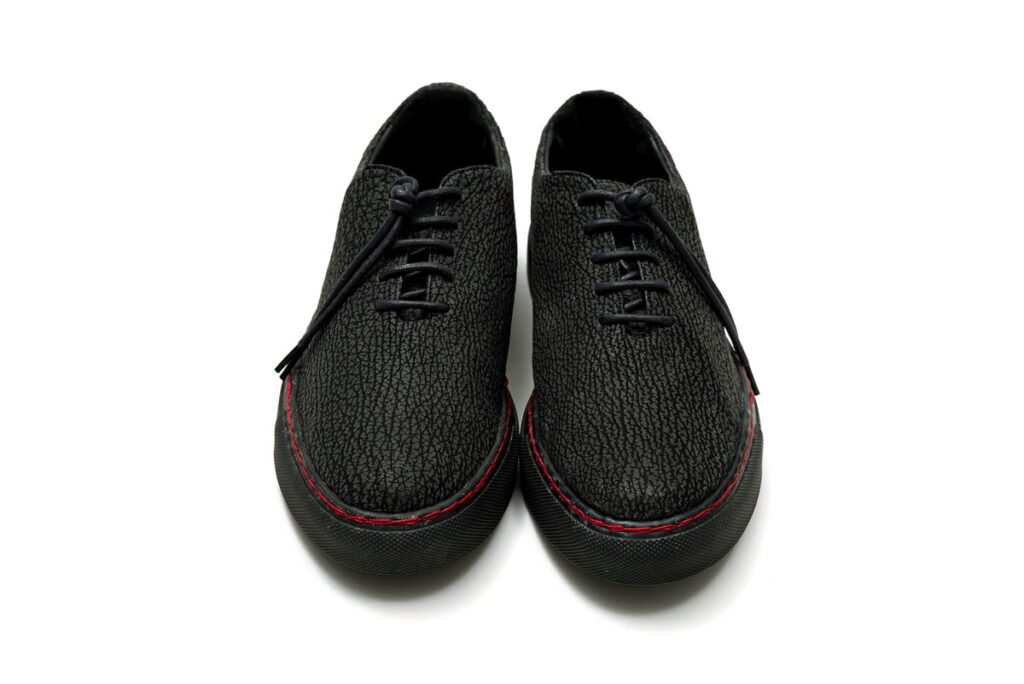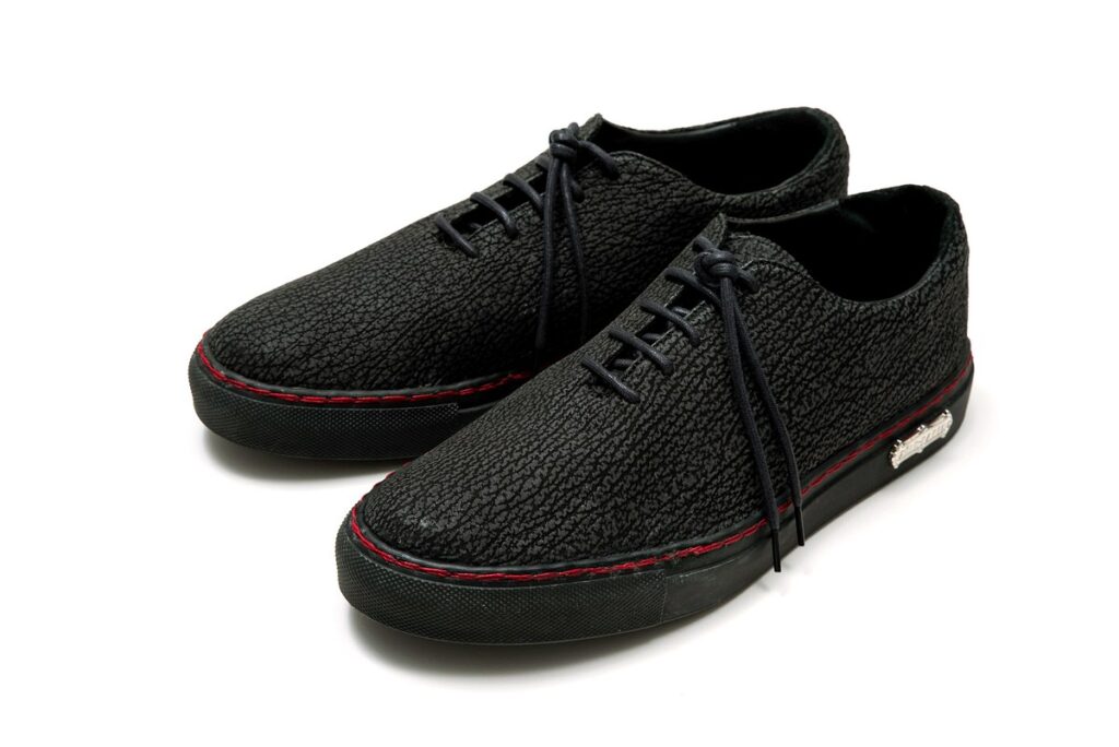 コチラのスニーカー、よくある黒レザースニーカーに見えますよね。「でも、それにしてはシボが強い気が……」と気づいたアナタはお目が高い。実はこれ、ただのシボ入りレザーではございません。シャーク、つまりサメの革を採用しているのです。シャークレザーの特徴は前述のシボですが、見逃せないのが水生動物ならではの耐水性・耐久性の高さ。梅雨時の日本のオシャレにもってこいの素材なのです。周囲をぐるりと取り囲む赤ステッチもクールで、春カジをグッとリッチに引き上げてくれますよ。