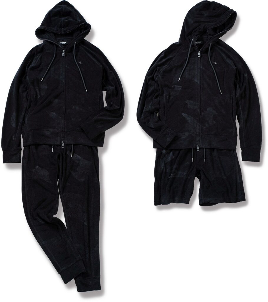 家でも街中でも着られるセットアップは、楽ちんオシャレに欠かせません。今回、みなさまにご紹介したいのが、「1PIU1UGUALE3 RELAX」のパーカー・ジョガーパンツ・短パンの3点セット。光の加減で見え隠れする黒カモフラ柄が、おやじ世代の短パンスタイルもオシャレに仕立ててくれますよ。