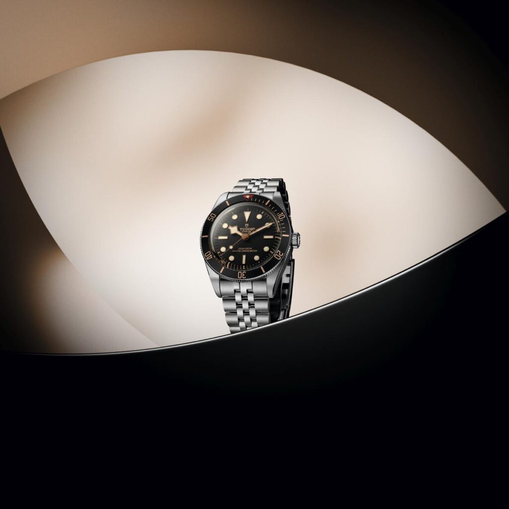 ブラックベイ コレクションは、1950年代に製造されたチューダー ダイバーズウォッチに着想を得ており、ダイアルには1969年のブランドカタログにあった「スノーフレーク」の名でコレクターに知られている、特徴的なスクエアが付いた針を採用している。プロテクターなしのリューズとケースの特徴は、初代のチューダー ダイバーズウォッチを想起させる。
