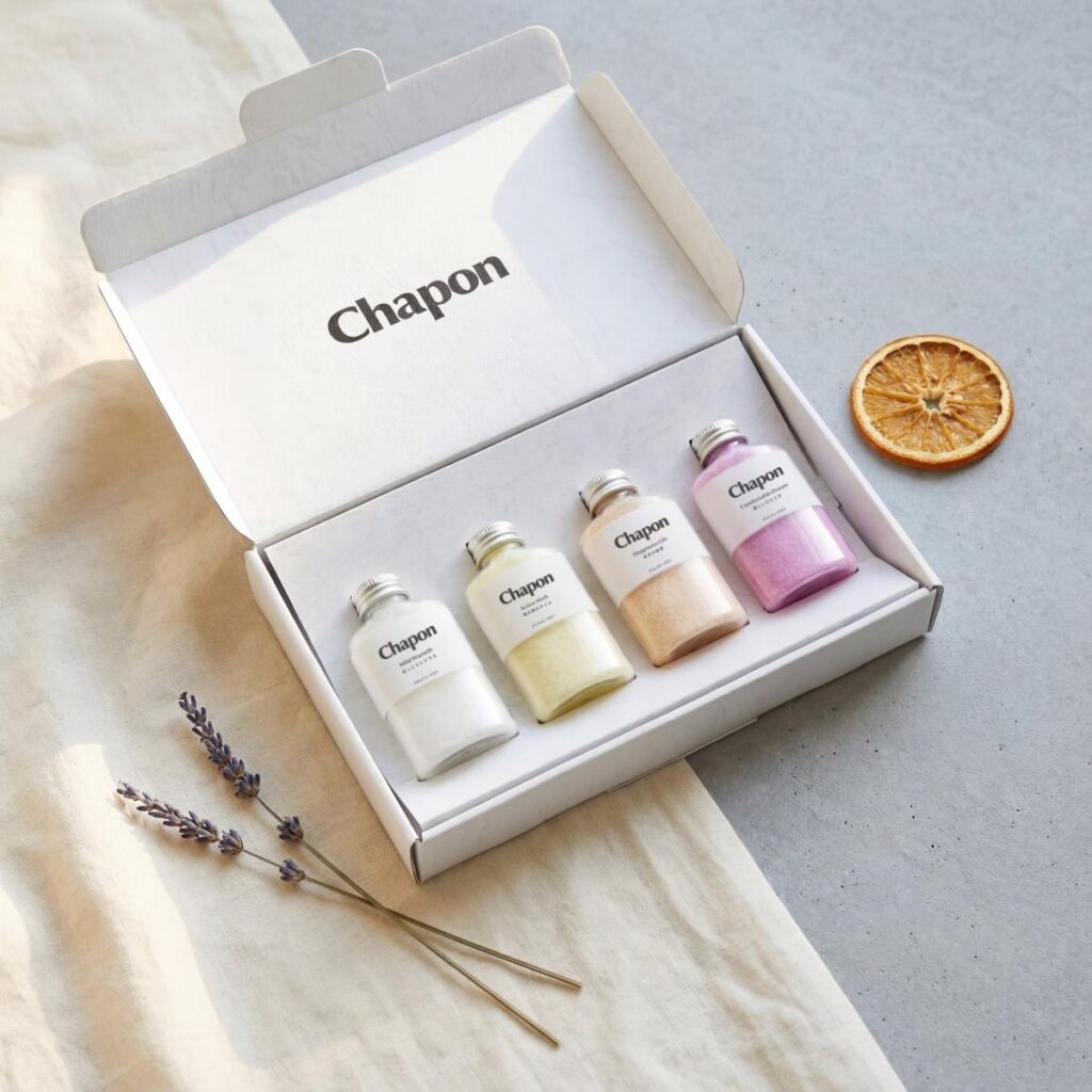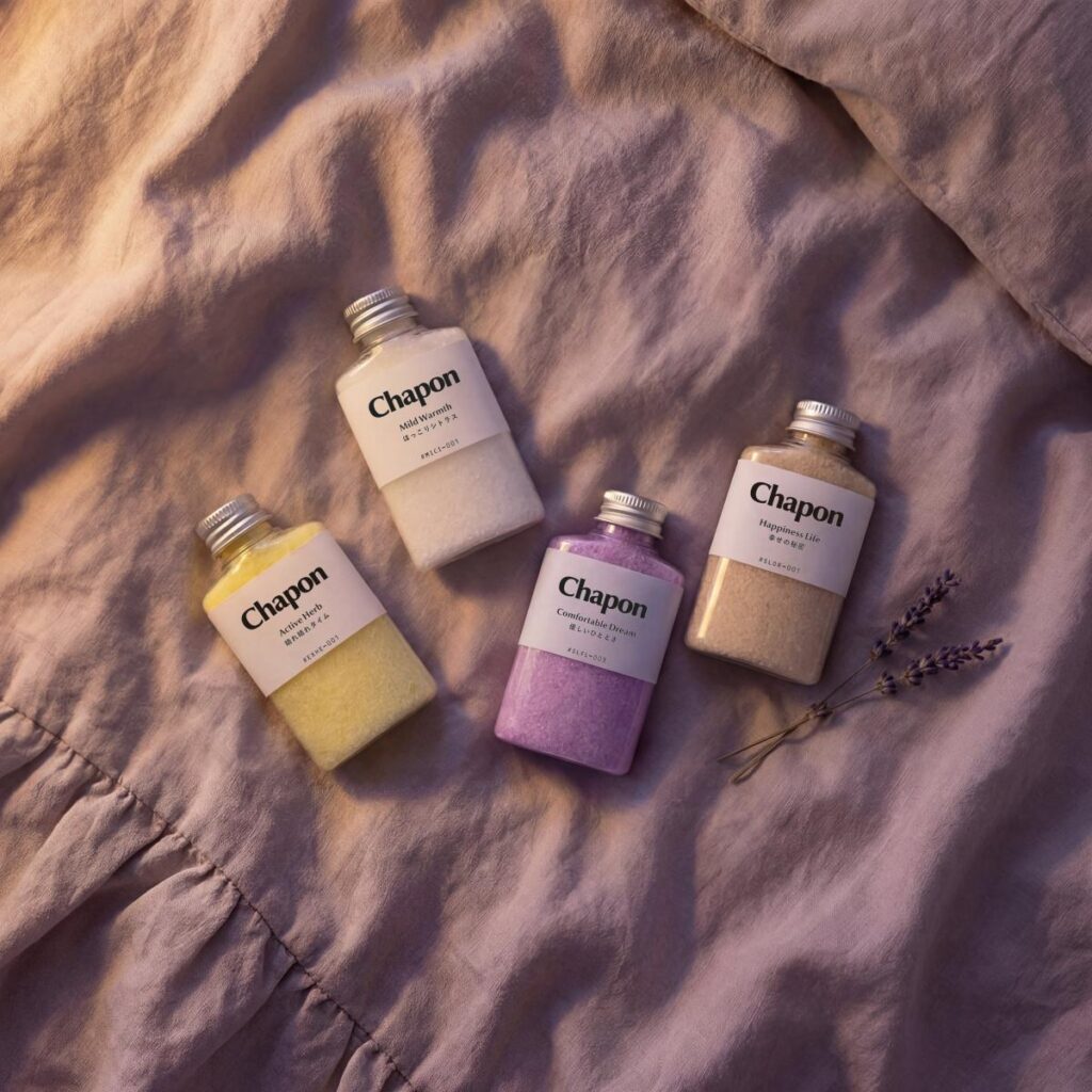 Chaponの「気持ちのきりかえ」セットは、そんな夜のために生まれた4本です。湯船に入浴剤を溶かした瞬間、ふわりと立ちのぼる天然精油の香り。深呼吸をするたびに、気持ちがふっとほどけていく。湯船を出る頃には、ちょっとだけ軽い自分になれる–お風呂の時間を、気持ちのきりかえのスイッチに変えてくれます。