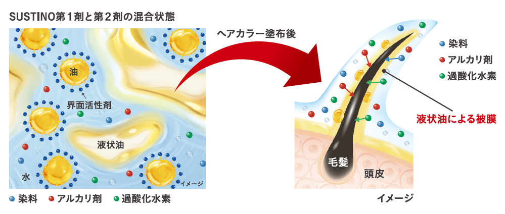 ヘアカラーは通常、第1剤(医薬部外品)と第2剤(医薬部外品)を混ぜることで、毛髪を染毛することができます。サスティノは第2剤の働きで疎水性の保護被膜を形成し、アルカリや過酸化水素による過度な影響を抑えながら毛髪ダメージを抑制します(バリア※2処方)。同時に、ヘアカラーの成分が毛髪内部へ適切に浸透し狙い通りの発色と良好な染色性へと導きます(アクセス処方)。さらに仕上がりはツヤやかでなめらか。ダメージを抑えた処方設計により、繰り返すヘアカラー施術でも良好な染色性と仕上がりをお楽しみいただけます。