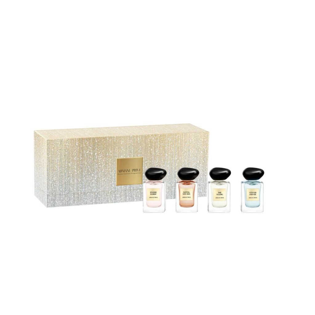 「アルマーニ プリヴェ セット」は、人気の「ユーロン」、「ベチバー ディベール」、「ピヴォワンヌ スジョ」、「サンタル ダン シャ」の4つの香りのミニサイズ(各7.5mL)がセットになっており、「アルマーニ プリヴェ」の人気の香りを色々試してみたい方におすすめです。