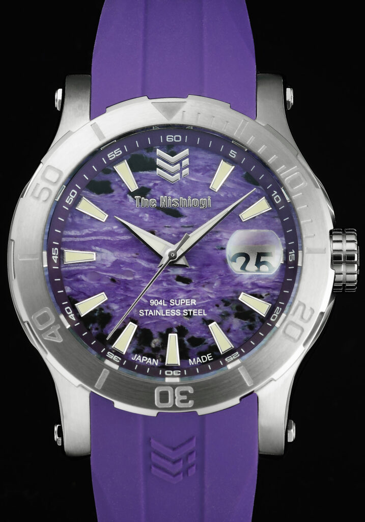 ハンダウォッチワールドが独自の審美眼で作製する『The Nishiogi(ザ・ニシオギ)』。フラッグシップモデルをベースに、ダイヤルにターコイズとラピスラズリを用いた天然石シリーズを登場させ話題を呼びましたが、この年末にはさらなる魅力を携えたモデルをリリースしました。その名も『チャロアイト シベリアのヒーリングウォッチ!』。チャロアイトとはロシアで発見された天然石で、シベリアというモデル名から想像すると何だか寒々しいクールな印象を受けますよね。しかしこの鉱石、癒しのエネルギーを持つといわれる人気のパワーストーンで、不安やストレスなどを解放してくれるホットな存在でもあるのです。世界三大ヒーリングストーンとしても知られ、安らかな気分にさせてくれることでしょう。