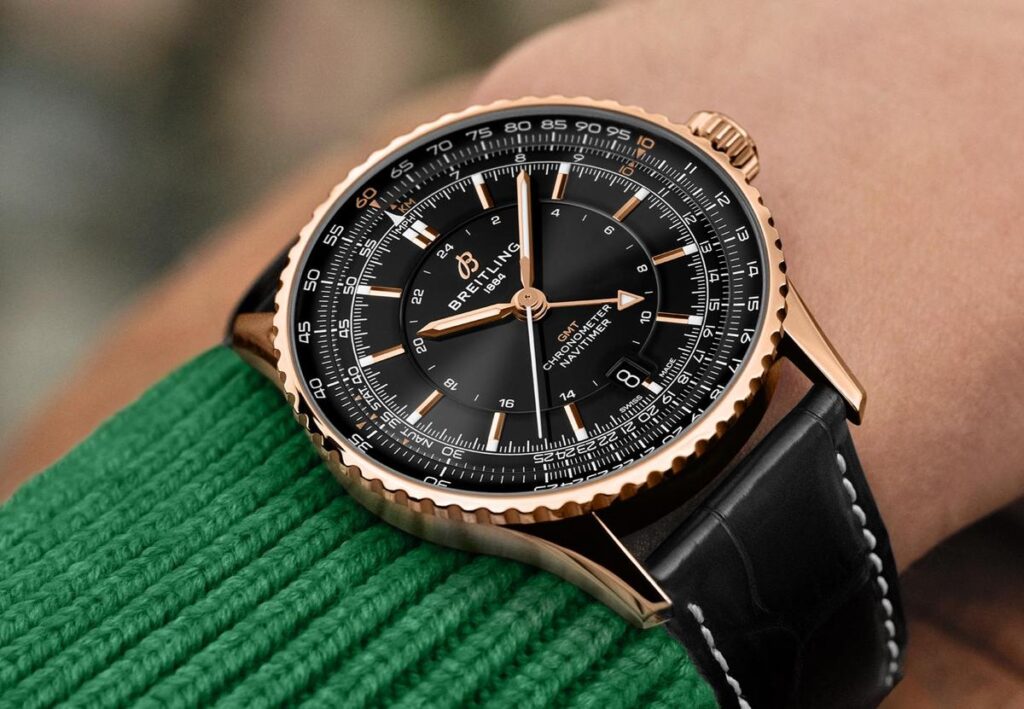 日本市場に向けて特別に製造されるナビタイマー オートマチック GMT 41 ジャパン リミテッドは、通常はグリーンモデルしか展開のない41mmの18Kレッドゴールドケースのモデルに、ブラックの文字盤を与えた特別仕様。インダイヤルのないGMTモデルならではのワントーンで整った文字盤により、確かな個性を抑制的に見せることに成功しています。ケースバックには「ONE OF 50」の刻印が施される、日本限定50本のモデルです。