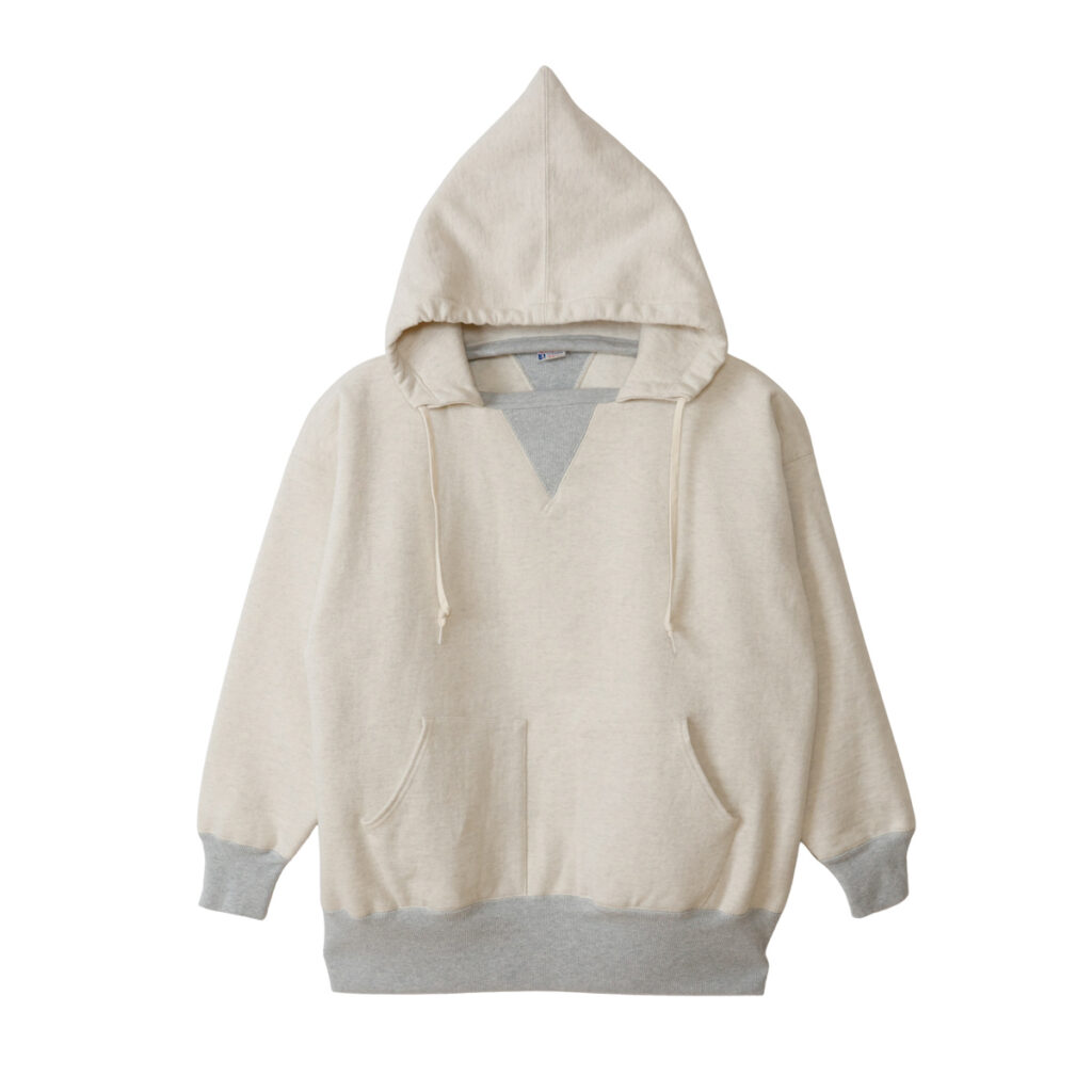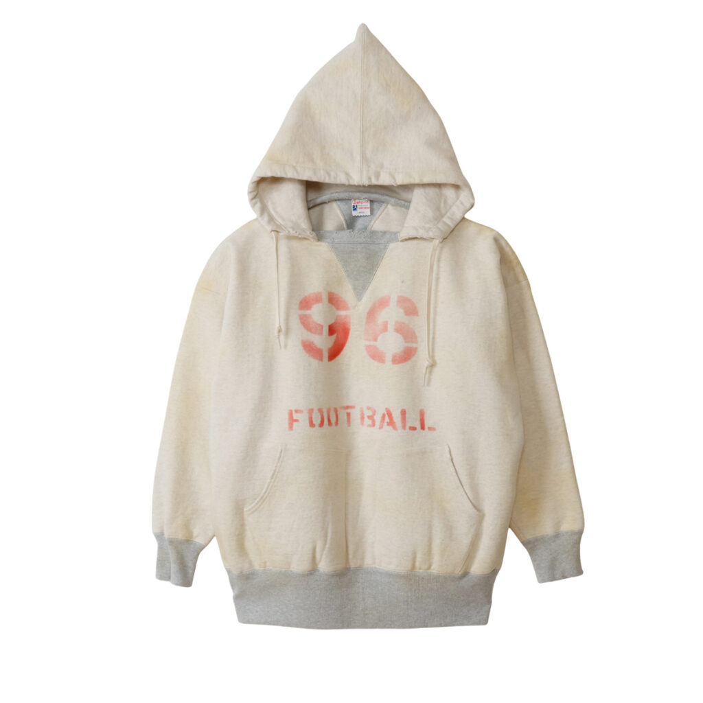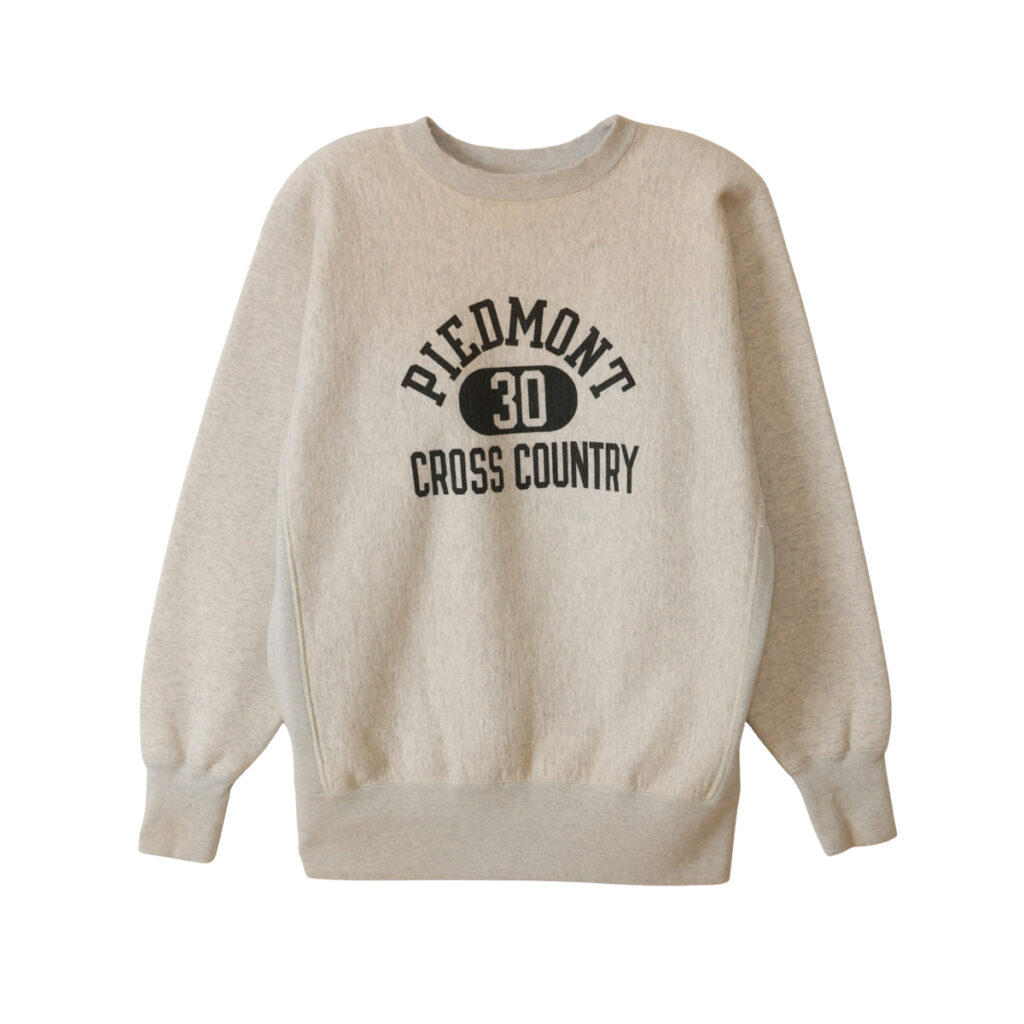 1950年代半ばにアスレチックラインとして販売されたアイテムの復刻版。裏起毛素材を二重構造にしてかさを上げ、寒い季節にも対応する保温性を持たせたダブルシックネス プルオーバーアフターフーデッドスウェットシャツです。当時の生地を忠実に再現したコットン100%の生地を使用。脇接ぎのない丸胴仕様や筒状の袖リブ、襟のリブにフードを挟み込んだ通称「後付けパーカー」、前後の襟に入れた「GUSSET(ガゼット)」など、当時の仕様を再現しています。旧式のシンカー編み機で編み立てた独特のボリューム感と風合いが特徴です。ヴィンテージ加工によって、経年劣化した色合いや風合いを表現。プリントは実在のヴィンテージ商品のデザインを踏襲。シルバーグレーのボディには染み込みプリント、ネイビーのボディにはプラスチゾルプリントを使用しています。左袖にCロゴワッペンが付いていない点も当時の仕様そのままです。