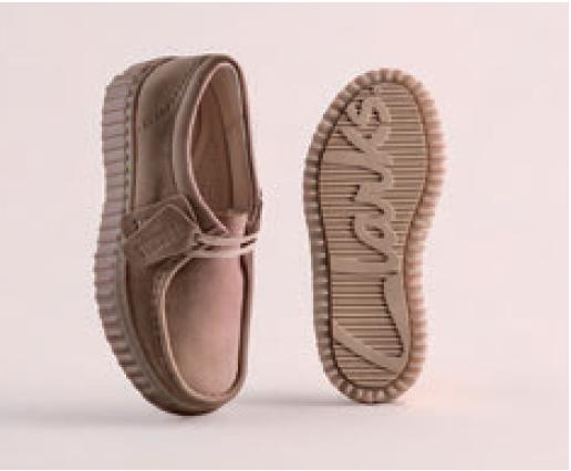 クラークスを代表するアイコン「ワラビー」からインスパイアされた「Torhill Lo」を、女性向けにアップデート。ワラビーのアッパーに、90 年代に誕生した厚底ソール「BigGripper(ビッググリッパー)」を融合し、クラシックな魅力にトレンド感をプラスしまた。軽量ながら耐久性に優れたアウトソールは快適な履き心地を提供し、靴裏の大きなClarksロゴも当時のデザインを継承しています。
