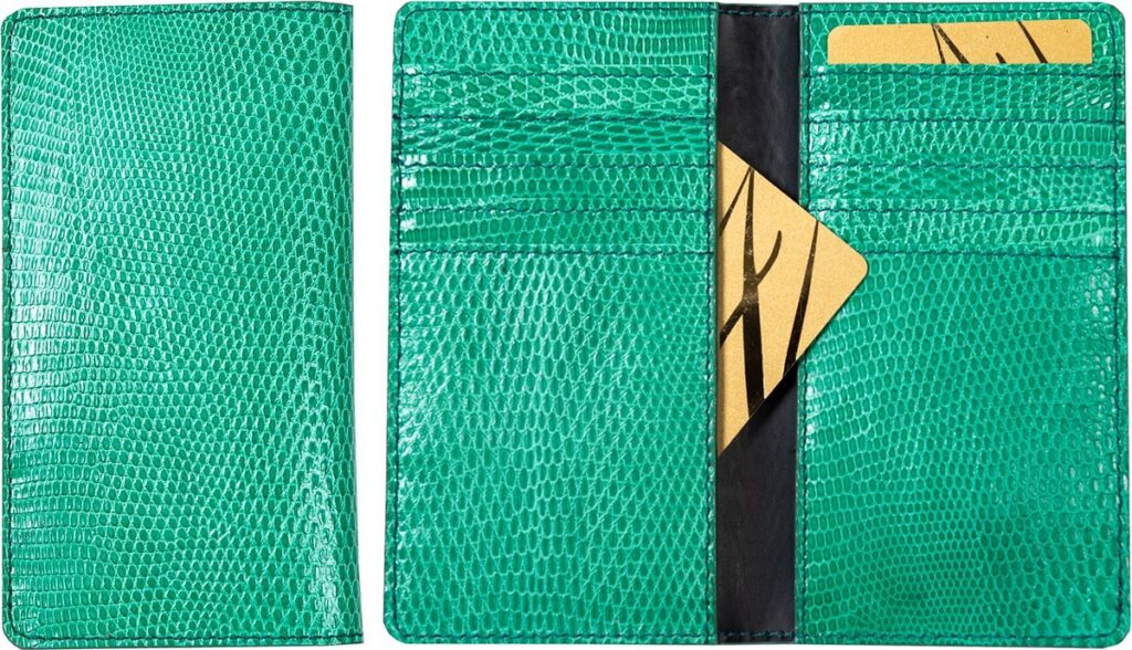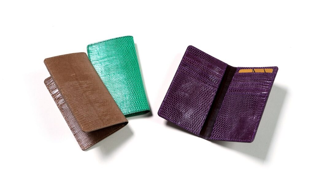 ケースを開くと、まずお目見えするのは両サイドに5つずつ並ぶカードポケット。さらに、スリットポケットを左右に備えており、そこもカードポケットにしたり、万が一のために紙幣を入れておくこともできます。素材には柄が美しいリザードレザーを採用。ご紹介するグリーン・パープル・ベージュのほかにもカラバリが展開され、計8色の中から好みの色を選べるのも嬉しい限り。ちょっと早めに女性へのクリスマスプレゼントとして押さえておくのもアリですよ。