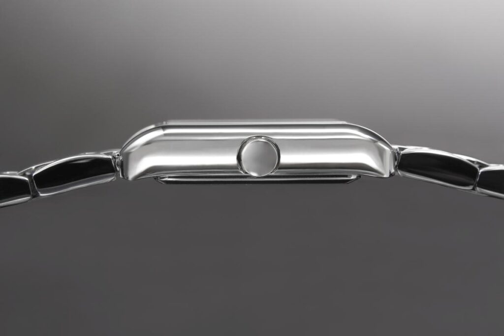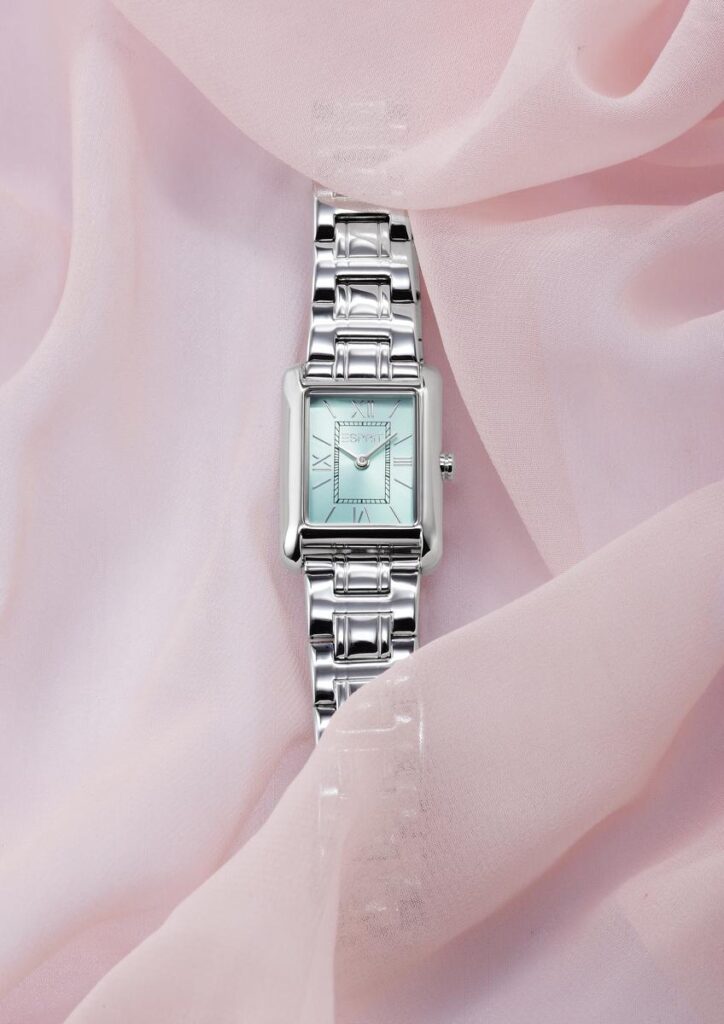 12時、3時、6時、9時がローマ数字、それ以外はバーのインデックス。ブレスレット感覚で楽しめるレクタンギュラー型の2針ウォッチです。