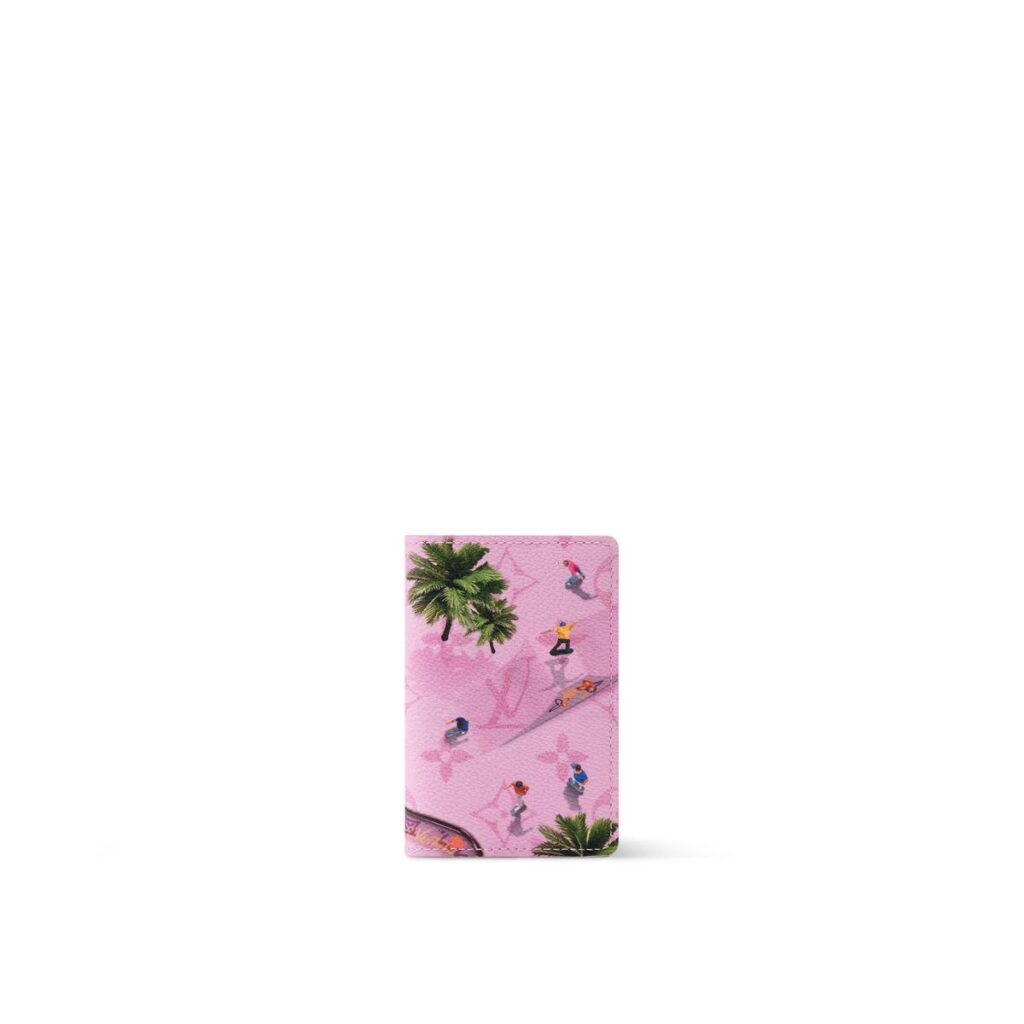 クラシックなカードケース、ウォレット、パスポートカバーに、空から捉えたミニチュアのスポーツシーンを、遊び心溢れるディーブブルーの屋外バスケットボールコートや、夕焼けの光に照らされたピンクカラーのスケートパークなどのプリントで表現しています。