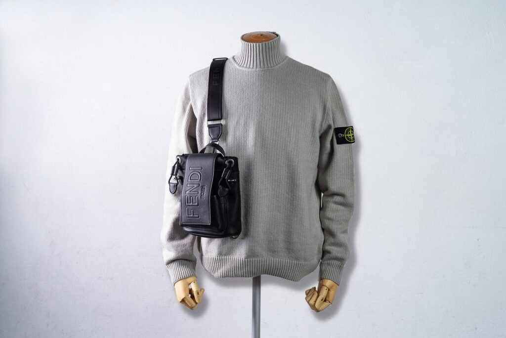 コチラの「レザー フェンディ ストライク ミニバッグ」は、ブラックのフルグレインレザーを採用したミニサイズのワンショルダー バックパック。「FENDI ROMA」のエンボスロゴをあしらったフラップがアピール度が高いのですが、見てくれだけで終わらないのが「FENDI」の矜持。クリップの付いた調節可能なテクニカルファブリック製ショルダーストラップを備えており、Dカンも前面の左右にひとつずつ、背面の上部にひとつ、底部にふたつの計5ヶ所に備えているので、斜めがけはもちろん、左右どちらの肩にもワンショルダーでバッグをかけられるのです。旅行時のセカンドバッグとしてもオススメいたします。