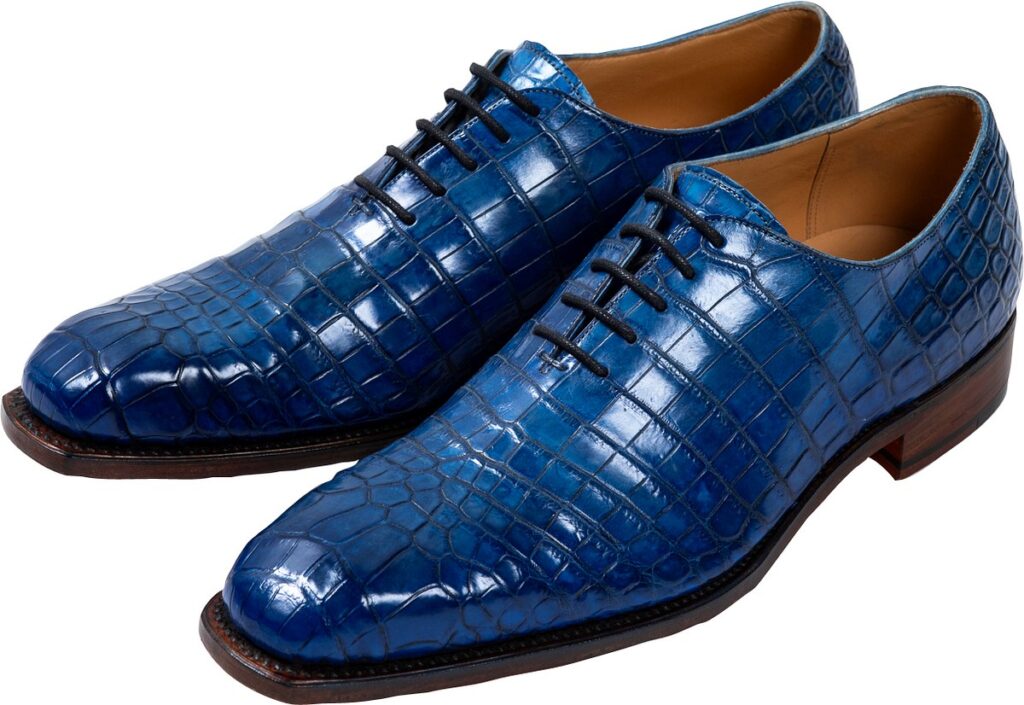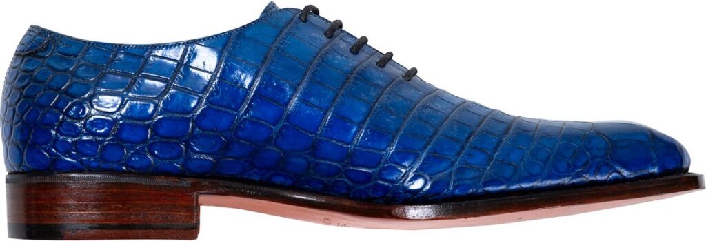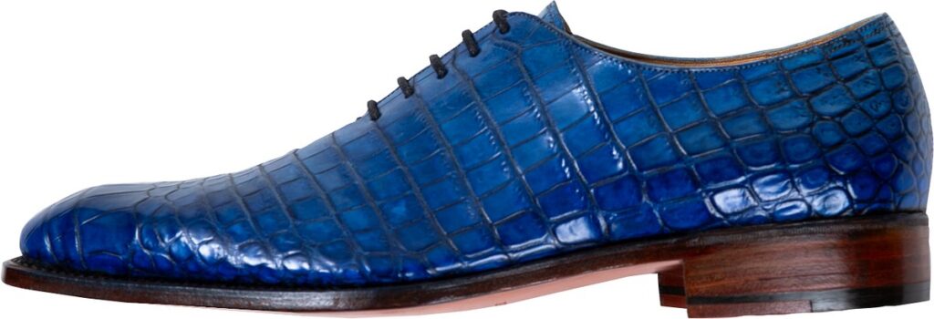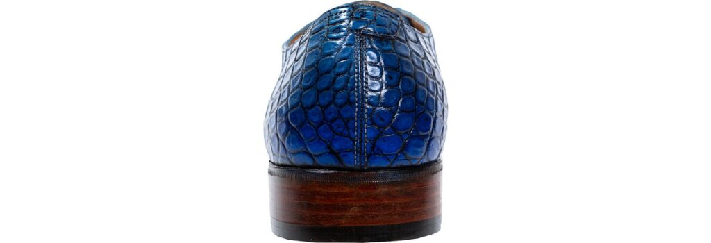 海の色を想起させる明るい青が美麗なコチラは、クロコダイル(ナイル) ソレーヌ ワンカットローファー。この「ワンカット」というワードにピンときた御仁は、きっとオシャレ通。そう、アッパーにもサイドにも継ぎ目がないこの靴は、1枚革で仕立てた特別な1足なのです。