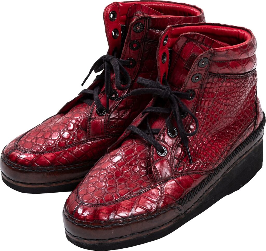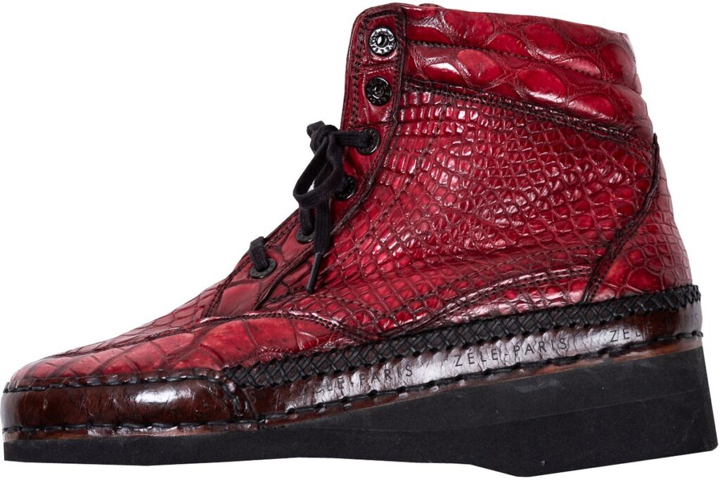 濃いめの赤がラグジュアリーなクロコダイル エミナンス ベルテッドブーツは、ミドルブーツとハイカットスニーカーのハイブリッド的なルックスも特徴的。ビブラムソールのヒールがちょい高めなので、足長とスタイルアップ効果も見込めて頼もしい1足なのです。
