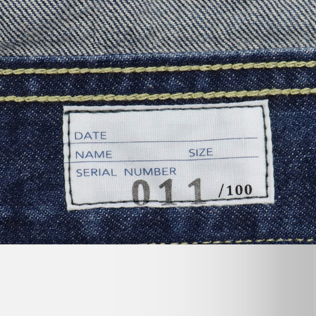 ジャケット同様に鉄製の月桂樹ボタンとリベットを採用。バックポケットの“レイジーSステッチ”や“H.P.L(ヒップポケットレーベル)”は省略された大戦期特有のミニマルな表情ながら洗練された仕上がりになっている。100着限定を示す、シリアルナンバータグが付属。