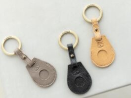 AirTag挿入部分とストラップにレザーを用いたAirTagケースは、金属製リング付きで、キーホルダーとしての使用や、スーツケースやバッグへの取り付けも可能です。