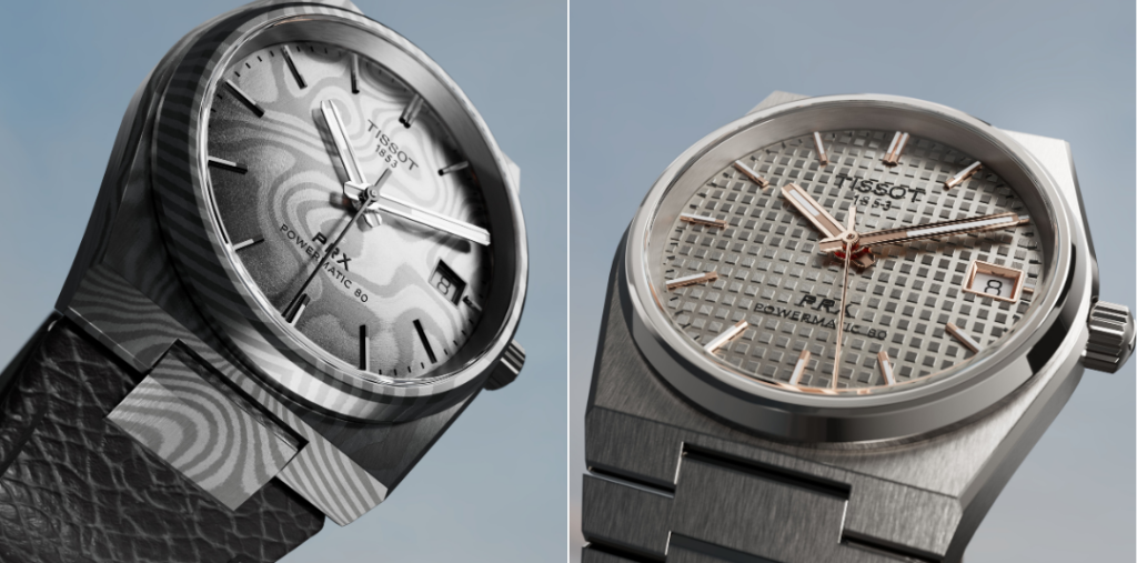ディープブルーの文字盤にニッケル仕上げのバトン針とアプライドインデックスを組み合わせたモデルと、チタニウムそのものに敬意を表したグレーの文字盤に、対照的なローズゴールドの針とインデックスを配したモデルの2種類が登場します。いずれもPRX パワーマティック 80の象徴的な要素であるワッフルパターンの文字盤を備え、コレクションの大胆でモダンなスピリットを強調しながら、優れた視認性を確保しています。