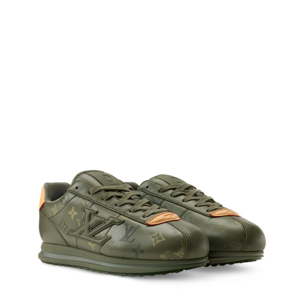 メンズ クリエイティブ・ディレクター ファレル・ウィリアムスが手掛けた今シーズンのモノグラム・サープラス パターンを施したキャンバスの「LV ティルテッド スニーカー」。ステンシルを用いた立体的なレリーフ技法でモノグラム・キャンバスを彩りました。その名の通り、シュータン部分にはやや傾斜したLV イニシャル シグネチャーの刺繍があしらわれています。メゾンのクラフツマンシップを想わせるヌメ革のハンドルマウントや、大胆な印象を与えるテキスタイルの太めのシューレース、トウ部分にダミエ・パターン、モノグラム・フラワーをあしらったチャンキーなラバーアウトソールなど、複数の特徴的なディテールが光ります。