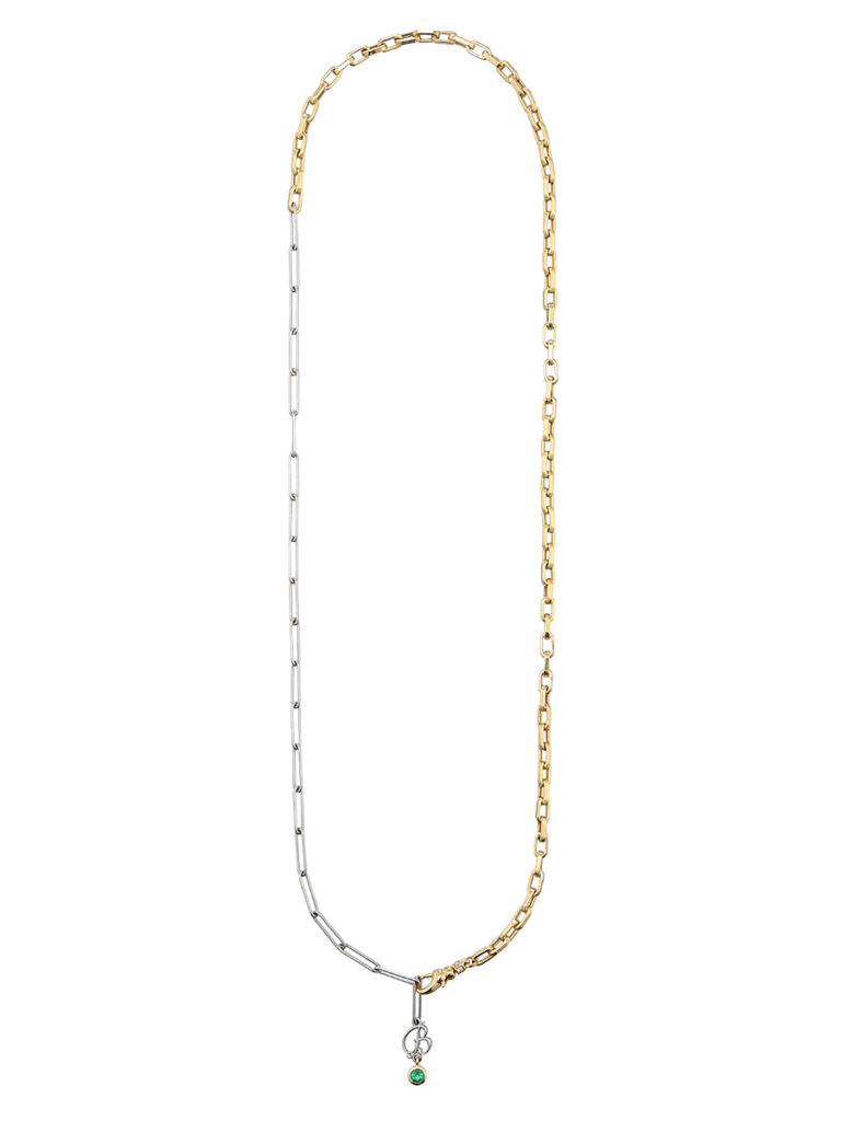 K18イエローゴールドとプラチナといった異なる素材のチェーンを繋ぎ合わせた【デュオチェーン】のネックレスとブレスレットには、MADISONBLUEのシグネチャー”Bマーク”と瑞々しいエメラルドをあしらい、印象的な存在感を放ちます。