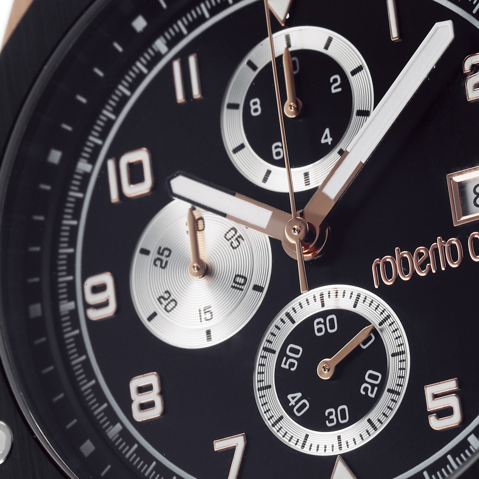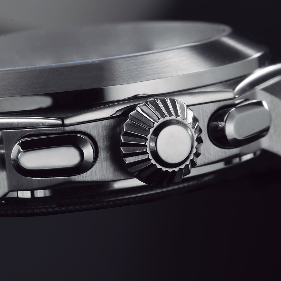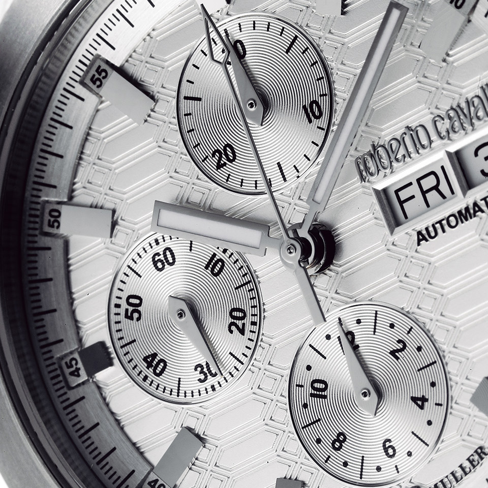 6時位置の12時間積算計、9時位置のスモールセコンド、12時位置の30分積算計のいずれもインダイヤルはコイル柄の模様が敷き詰められている。ベルトはステンレススチールとリアルレザーの設定。