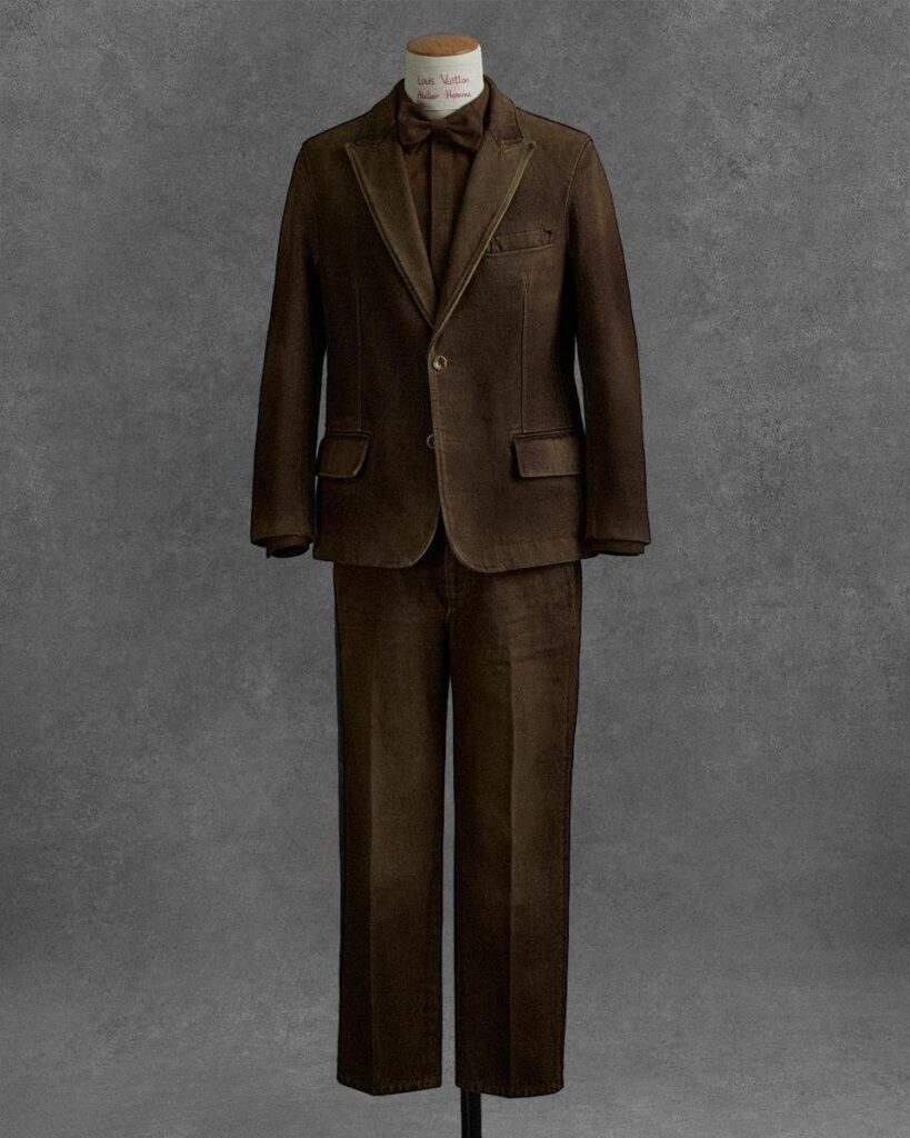 ジェレミー・ストロングは、新作のコーヒービーンカラーのインディゴデニムで仕立てられたシングルブレストジャケットに、同カラーのパンツ、ブラウンのシャンブレーシャツ、ブラウンのシャンブレー蝶ネクタイとブラウンレザーの「LV バターソフト スニーカー」を合わせました。
