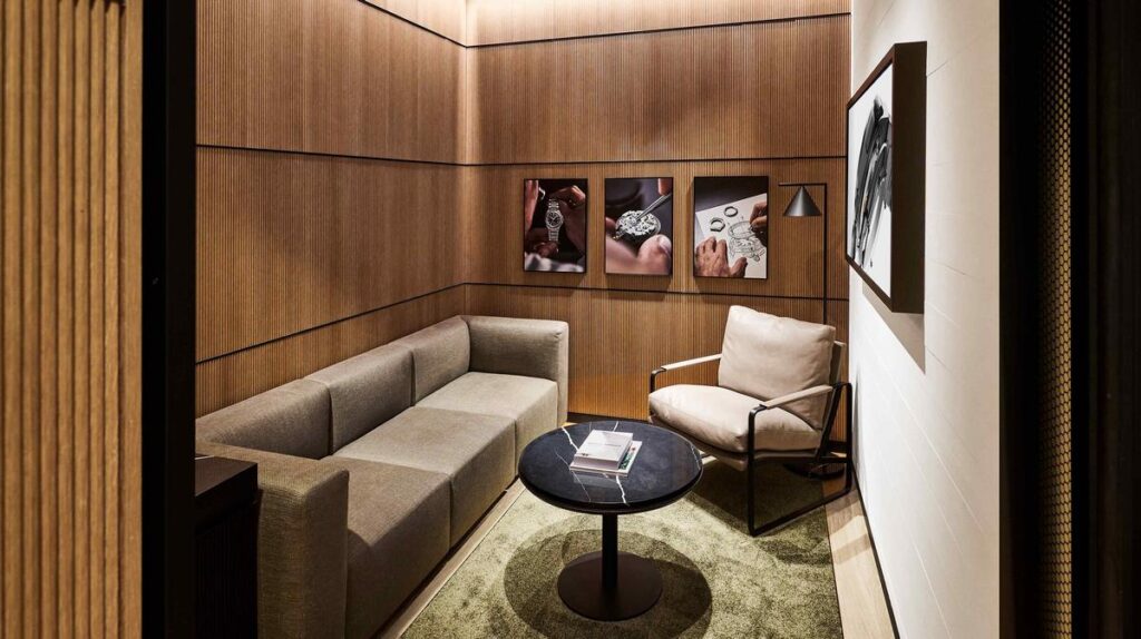 ブティック内はあたたかな色合いのグリーンやウッドウォールに包まれ、落ち着いた佇まいでお寛ぎいただけます。ブティックの奥の ラウンジスペースでは、プライベートな空間で寛ぎながら、コレクションをお楽しみいただけます。