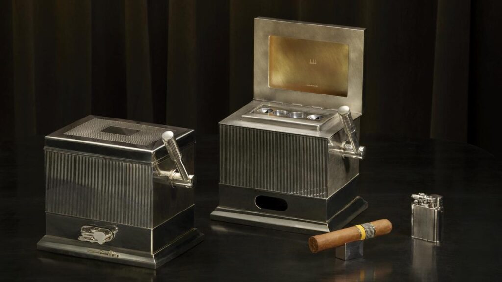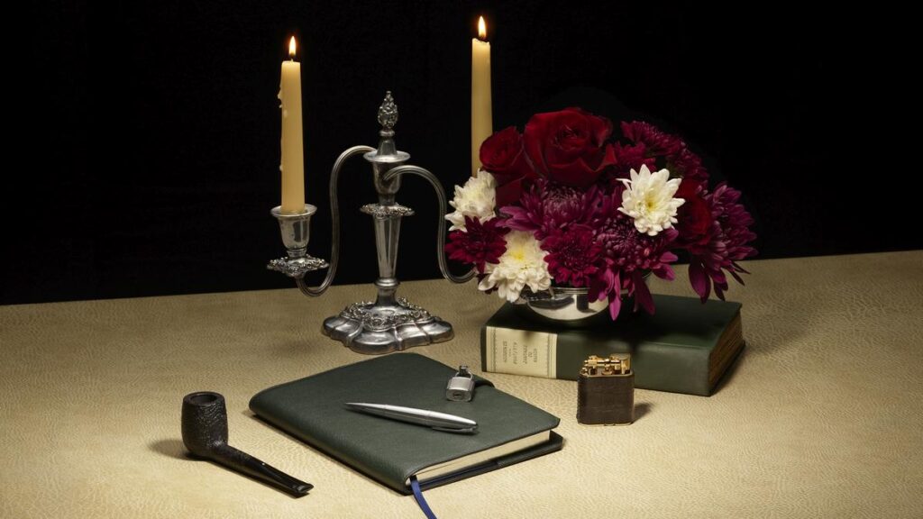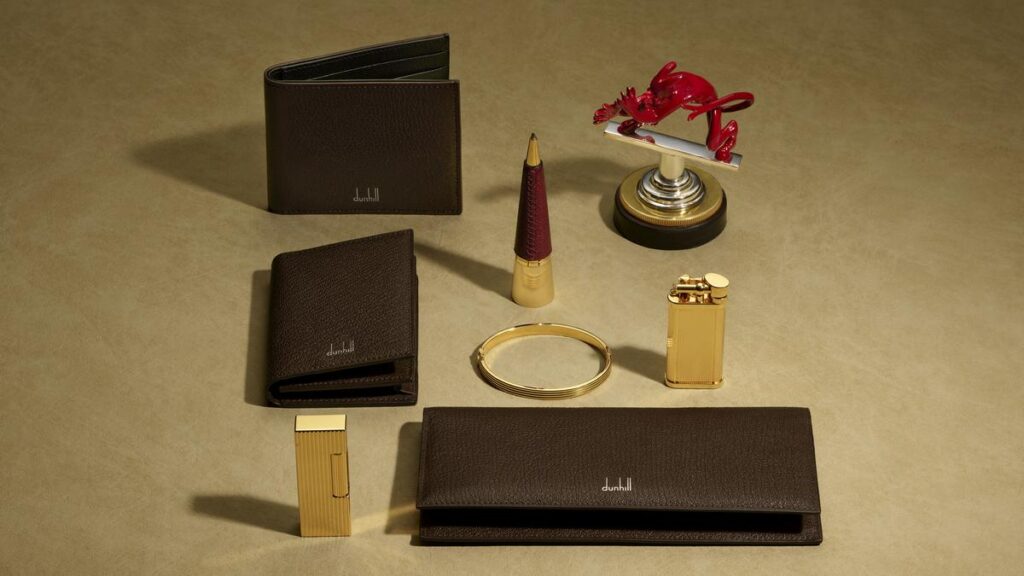 また、ダンヒルを象徴する革新的なアイテムも、華やかな装いで再登場します。大胆な建築的デザインを特徴とするシルバープレート仕上げのシガーカッター テーブルライターは、機能性と存在感を兼ね備えています。ゴートスキンで包み込み、ゴールドプレートを施したローラガスライターは、ゴールドプレート仕上げでミッドセンチュリーの系譜を受け継ぎながら、ダンヒルのアイコンを触感豊かに再解釈しています。