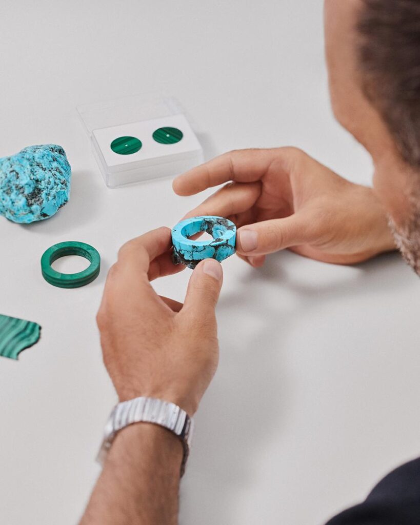 装飾石を組み入れることで、「エスカル」のストーリーはさらに深みを増し、自然界の贈り物の溢れんばかりの美を讃えます。ターコイズとマラカイトはどちらも、そのユニークな鉱物構造により、古代から装飾品として使用されてきました。ターコイズの濃い筋目は大河の分岐した支流を想わせ、マラカイトの縞模様は太古の地質形成の層を成す外観を彷彿させます。こうした特性こそが、石に美しさと同時に繊細さをもたらしているのです。